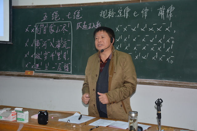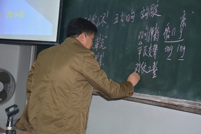 为了保护同学们的积极性和创造性,进一步提高同学们旧体诗创作的水平,宣传处郑主任亲自主持了本次讲座。郑主任先是由王之涣的五言绝句《登颧鹊楼》开始,以解剖麻雀的方式,引导同学们一一归纳出五言格律诗的若干特点:义理晓畅;字句有数;平仄交替;联内对仗;联间粘连;讲究押韵;注意变化;追求意境。而后在五言绝句基础上,通过句首遇平加仄、遇仄加平的方法,拓展到七言绝句的格律规律。进而又在五绝、七绝基础上,运用粘连的方法,扩充为五律、七律诗的格律规律,环环相扣,循序渐进,深入浅出地概括出了各种格律诗常见的格律模式。