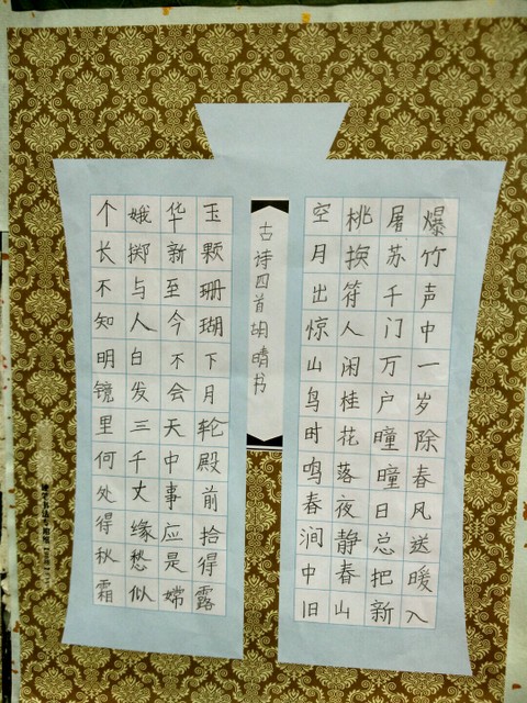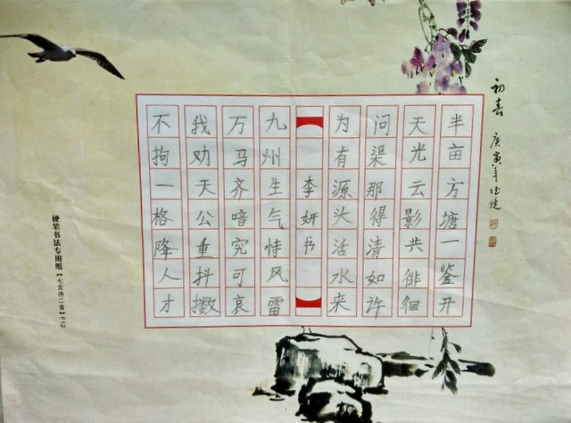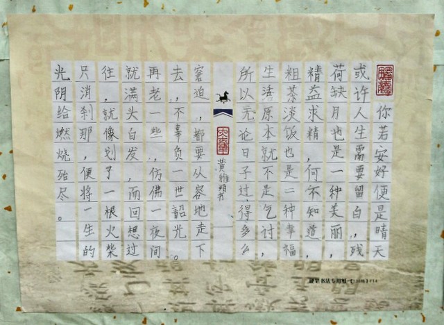 经过一个多学期的硬笔书法学习,他们在硬笔书法上有很大的进步,此次展览中,全体同学积极参与,从中选出一些优秀作品进行展出。在书写作品时同学们满怀激情,用心书写每一笔笔画、每一个汉字,尽其所能地展示自身书法的才能。作品中无不透着或规范、或严谨、或灵动的气质。他们认真、严谨的态度为我们做出了榜样,背后却付出的是辛勤的汗水。学习书法“贵在坚持,方能收效”,借这次展览的东风,希望同学们从平日点滴做起,培养正确的书写姿势、提高写字的正确性、规范性和美观性。“用笔在心,心正则笔正”,也希望同学们端正姿势,用心写字,踏实做人。”