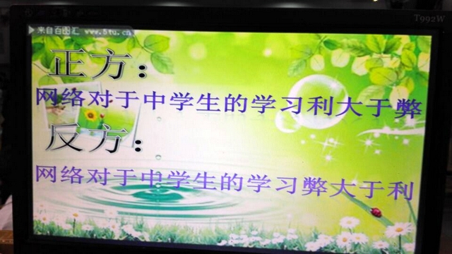 这一轮的辩题是“网络对中学生的学习是利大于弊(正方),还是弊大于利(反方)”。在H99对阵H90的比赛中,正方H90的三辩让我们记忆尤深,他反应迅速,并以其独特的见解驳倒反方,其次是正方四辩,他的小结可谓强劲有力,很是有“杀伤力”。反观反方H99,丝毫也没有要让着正方的意思,他们凭借可靠有力的数据让正方好几次都招架不住。但双方都有不足的地方,正如反方H99班的领队毛小波主任说,辩手们对问题的看法太片面,中途也有一些诡辩论出现,尤其是一些不恰当的例子,而且他们对辩题的理解不够深,很狭隘,以至于最后走进了一个死胡同。