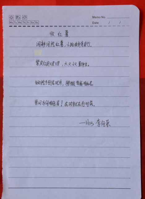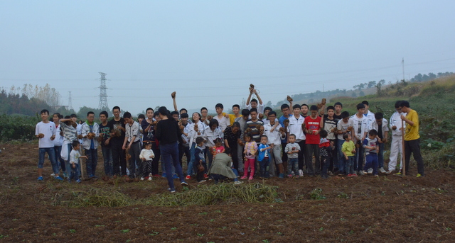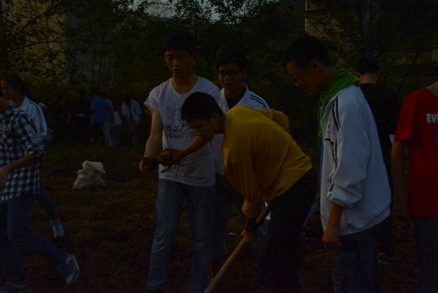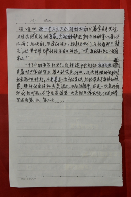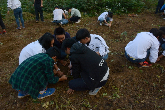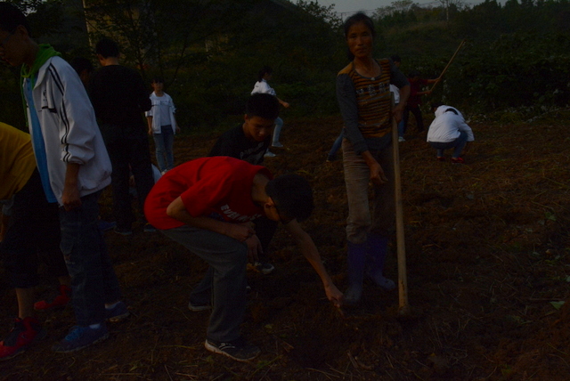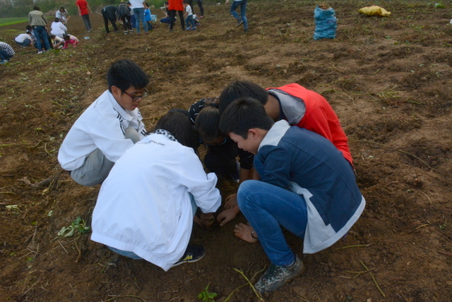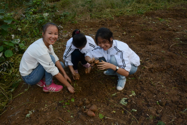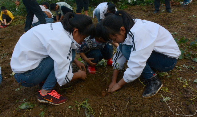 由于锄头数量不够,……同学便“手动”开始刨红薯了(谭媛)。只见同学们成了小聚落,散布在黄土地上,仿佛绿叶丛中点缀的几簇花团,尤为怜爱(罗依婷)。我和其余四个同学在地里“扫荡”,不停的在找猎物——红薯。我们有过几次特大的收获,但也有几次令人啼笑皆非的“糗事”:开始,我们团一直在找果藤很粗的地,坚信一定能挖到大的红薯,结果却是足足挖了半个小腿深的坑,却只得到一根巨大的藤,其余空空如也(谭媛)。