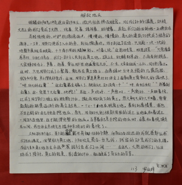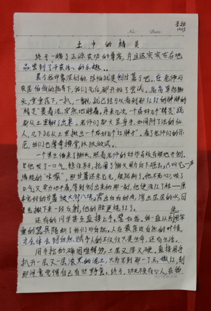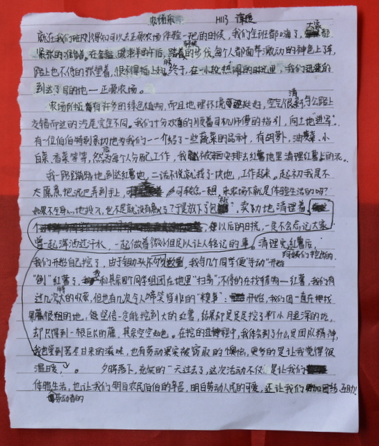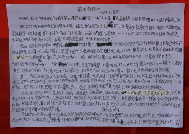 其间,我们还用旁边的泉水洗了红薯啃掉皮,吃了起来,因为班主任说他们小时候都是这样吃的。我也吃了,虽然没有什么味道,但有我们的辛勤劳作,我觉得挺好吃的”(刘晨阳)。