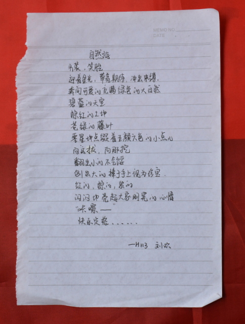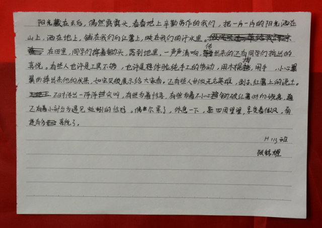 高一的同学们则积极响应宣传处的号召,当天晚自习就用文字记下了他们的劳动过程和切身感受。尽管时间仓促,但有诗歌,有散文,叙事生动,体会真实,而且笔者惊异地发现,交到宣传处的罗依婷、谭媛、李扬、刘晨阳、刘欢、李向荣、张铭耀等7位同学的八篇作品,描述角度各异,几无雷同。于是,笔者突发奇想——把他们的作品整合成一篇文章,居然不需要补充半个连缀的字或词,像老和尚的百衲衣,而又天衣无缝,浑然天成,如行云流水。又如能工巧匠们不用石灰和水泥,构筑了一座华美而稳固的小屋,如幼儿园的小朋友搭建了一座高耸、壮观而不倒的积木。