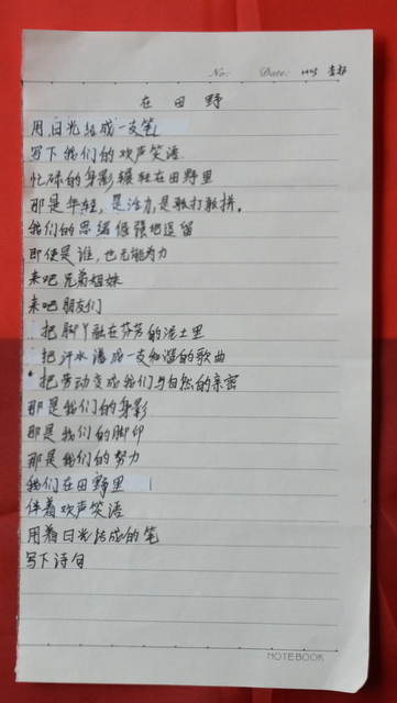 我们在田野里/伴着欢声笑语/用着日光结成的笔/写下诗句(李扬)