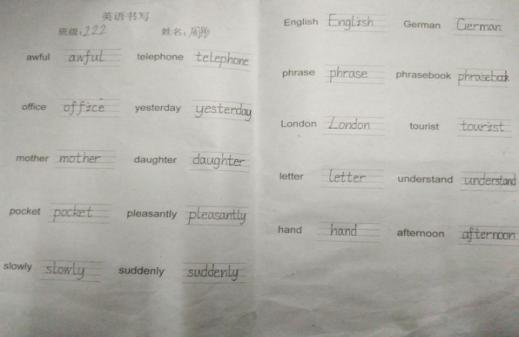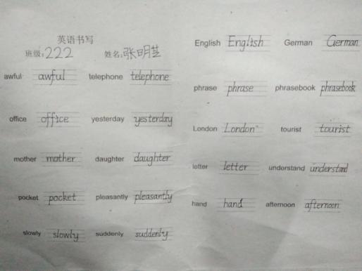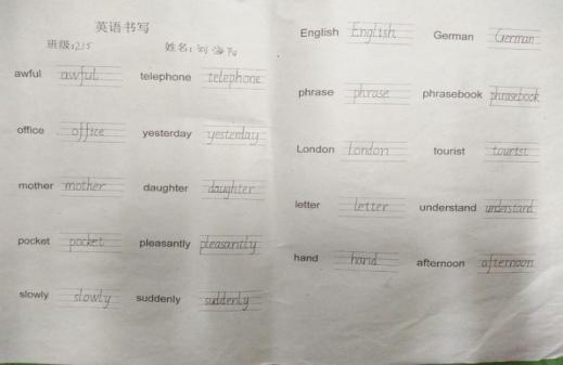 俗话说,字如其人。良好的书写习惯,不仅反映了一个人端正的学习态度,更是其良好的学习习惯的重要组成部分。为了培养小学生良好的英语书写习惯,规范小学生的英语书写,提高学生的英语书写能力,三年级英语单词书写比赛于11月21日晚举行。三年级的学生们全员参与,全身心地投入到本次书写竞赛。通过本次的英语单词书写竞赛,不仅激发了三年级学生爱写英语的热情和写好英语的自信心,也给学生提供了一个展示自我的舞台,更为他们今后继续学好英语打下了良好的基础。