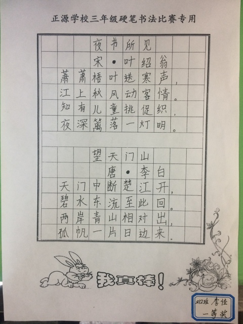 为了进一步弘扬中华民族书法文化传统,丰富校园文化底蕴,培养全体学生认真书写的良好习惯,提高学生写字水平,小学部三年级于12月5日晚自习期间举行了硬笔书法比赛。本次活动全员参与,参赛选手们个个满怀激情,用心书写每一笔,每一画,所写作品大多笔画流畅,结构匀称,整体美观。经过评委们的精心评选,评出一等奖10名, 二等奖20名, 三等奖30名。通过本次活动,激发了学生的书写兴趣,促进了学生的规范书写,为学生的书写起到了深远的影响。