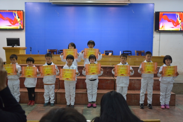 在评委们统分时间,全场10个班,500名可爱的小同学同唱《我爱北京天安门》 《小龙人》,富有感染力的歌声将全场气氛激发到最高点。