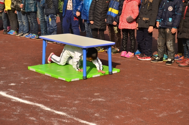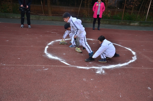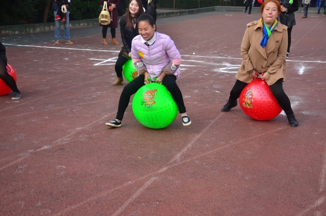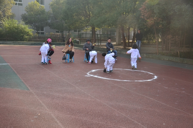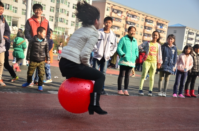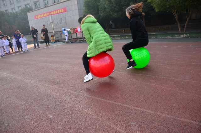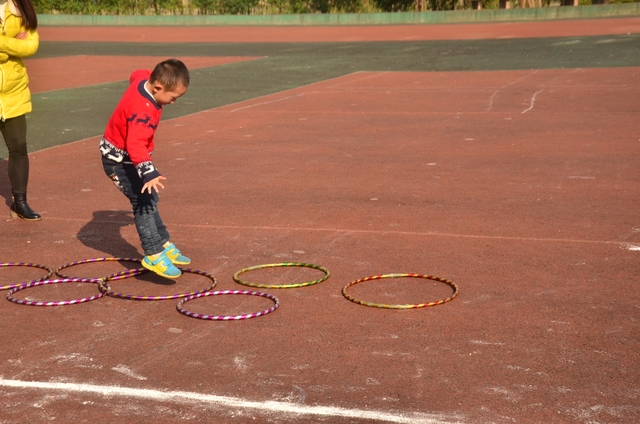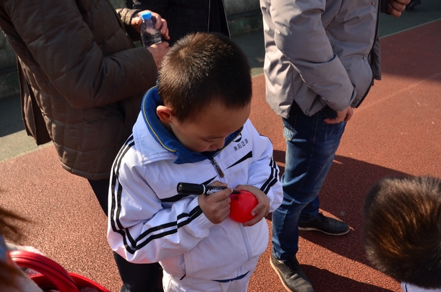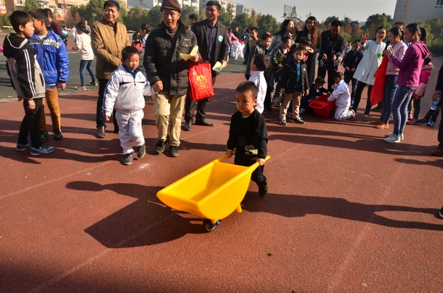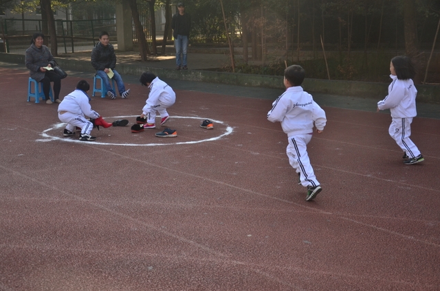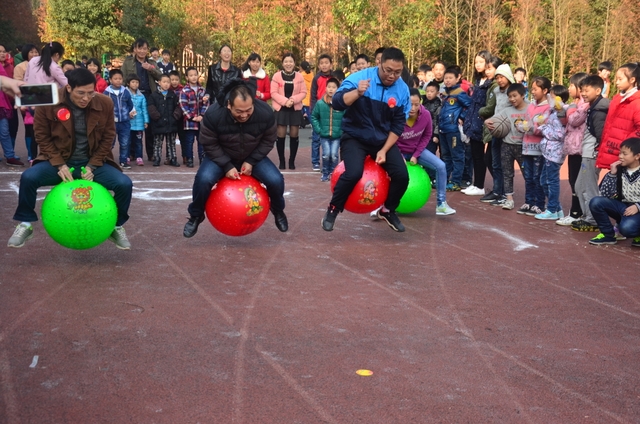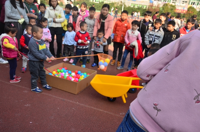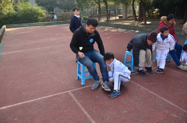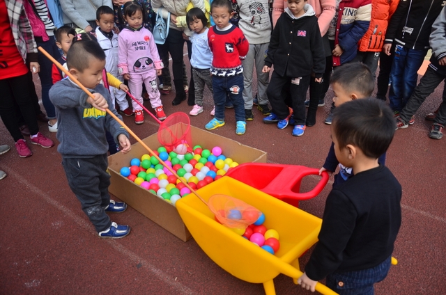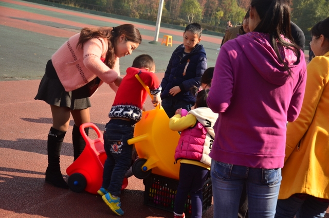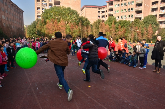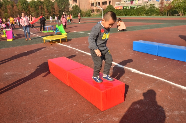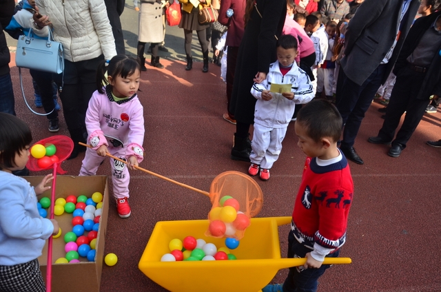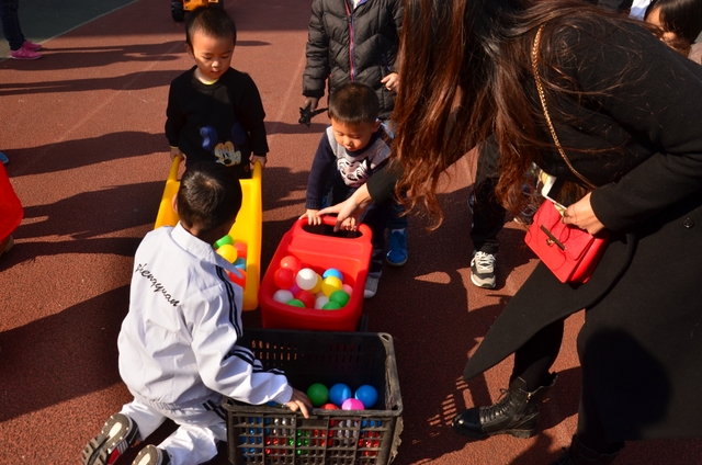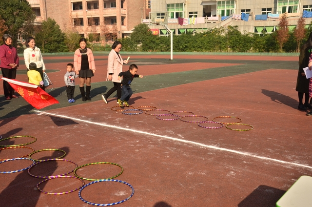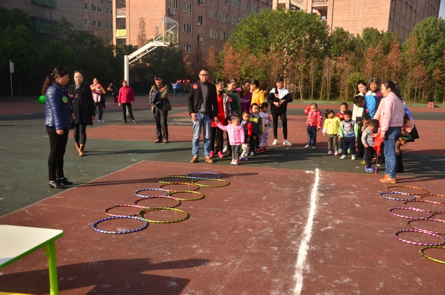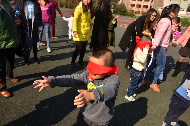 亲子运动会以分组闯关的形式进行:《羊角球比赛》 《我给爸妈穿鞋子》 《我的亲人在哪里》 《感统训练—障碍跑》 《齐心协力运小球》 。每一关都巧妙地融入了跑、跳、钻、爬、平衡等幼儿应掌握的基本动作,其中前四个项目都由家长和自己的孩子共同完成。七八十名学生分为红、黄、蓝三组,各组由一名老师任组长。在她们的带领下,以情境引入,孩子们和家长积极参与,比赛场上人声鼎沸,热火朝天,处处充满欢声笑语,而又不乏紧张激烈,还夹杂着个别孩子的懵懂、哭闹和家长的滑稽、幽默,使整个赛场妙趣横生,快乐无穷。