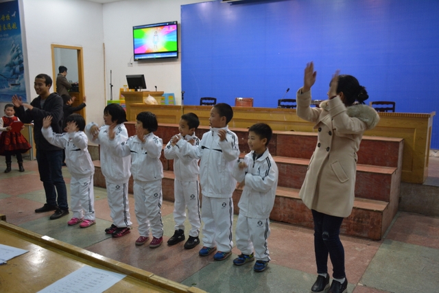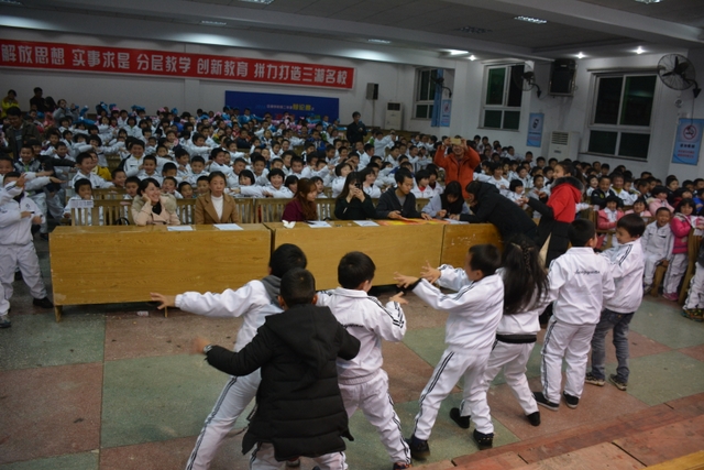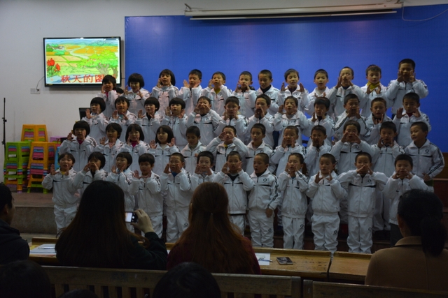 晚上6点40分,暖场的音乐让整个报告厅弥漫着文学的气息。比赛以班为单位进行,以抽签决定表演顺序,评委根据整体的表现打分。第一个节目是285班孩子带来的《游子吟》,稚嫩的童音轻轻吟唱,将观众带入了一个诗歌的世界。第二个出场的是282班的孩子,他们用全新的朗诵方式诠释着自己对老师的喜爱和感恩之情。接下来是由286班带来的《我真希望》,舒缓的音乐以及深情的朗诵赢来了阵阵掌声……中场休息由颜娟老师带着大家一起唱歌跳舞,报告厅立刻成了欢乐的海洋。