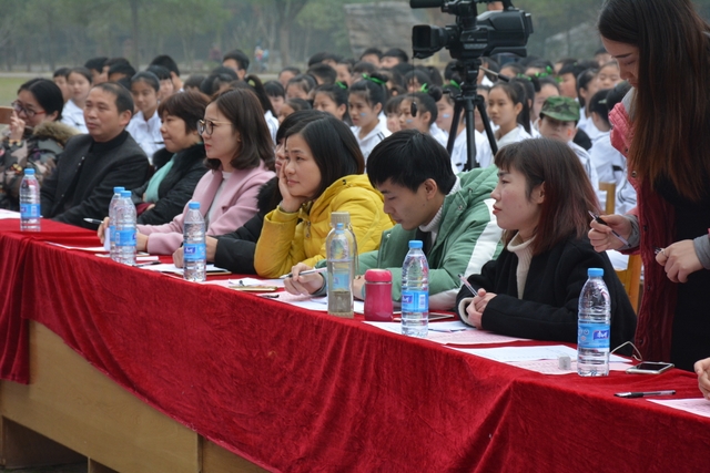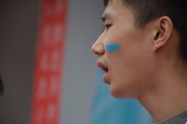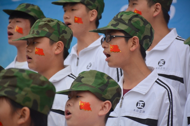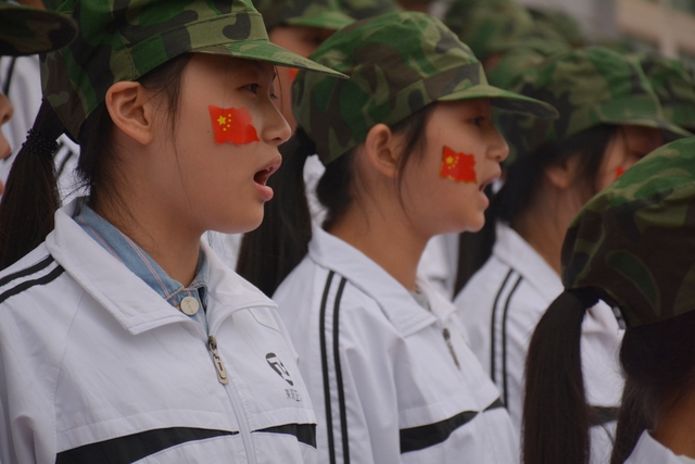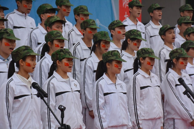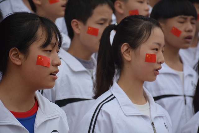 到场的初三全体13个班700余名学生,身穿白色的校服,如同天使般闪耀。他们精神饱满,跃跃欲试。场上热闹非凡,人声鼎沸。一个个班级,全都“装备齐全”。扎绿头带、抹油彩的;高举字板的;戴白手套的;戴小军帽,贴五星红旗的……八仙过海各显神通,看来是场大较量。