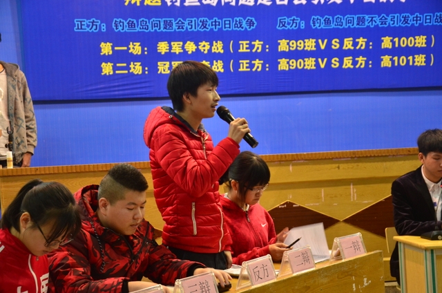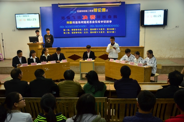 第一场是正方高99班VS反方高100班的季军争夺赛。黑服与白服的较量。双方你攻我守,谁也不示弱,就像中国功夫中的太极,看似简单实则暗藏锋芒。100班的三辩与四辩逻辑清晰,问答精巧;99班也不甘示弱,回击巧妙,高材生与高材生的对决果然不容小觑啊!第二场是正方90班与反方101班的冠军争夺战,一方热情沉稳,稳打稳扎;一方理直气壮,旁征博引。一方步步紧逼,攻势凌厉;一方转攻为守,筑牢铜墙铁壁。不断有新的角度被发掘,不断有新的漏洞被攻破。