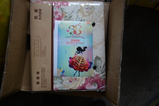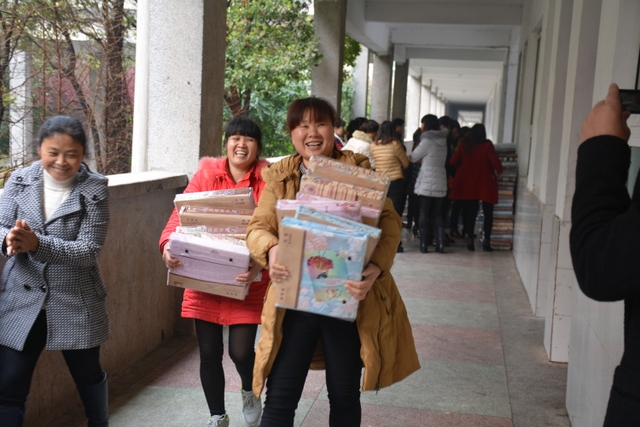 上午九点,各年级、处室、宿舍楼栋、食堂女工代表陆续来到学校仓库。看到精美的礼品——被套,和学校专门制作的精美贺卡,个个脸上抑制不住笑容,一如怒放的桃花。教师代表刘海英表示:非常感谢学校,感谢罗校长。巾帼不让须眉,我们要把学校对女教师的特别关爱化作动力,爱校敬业,为学校的发展做出更大的贡献。宿管部副主任戴桂兰表示:看到这样精美的礼品很令人感动,我们要把寝室管理搞得更好,让学生满意,让家长放心。学校办公室秘书阳丽娟老师代表学校分发礼品,并祝全体女教职工节日愉快。