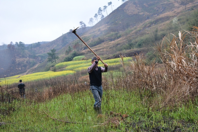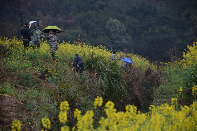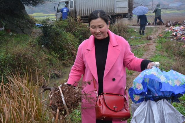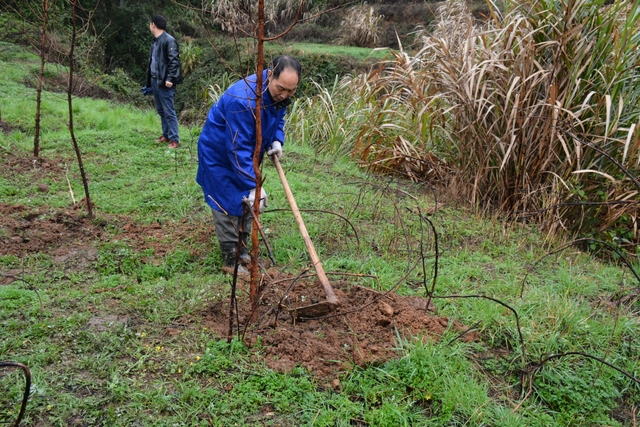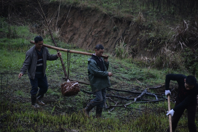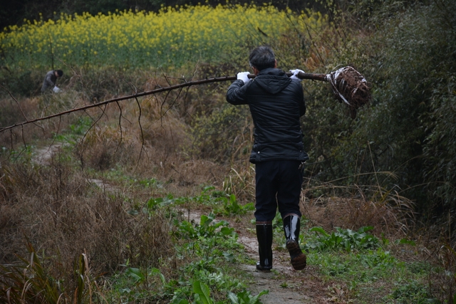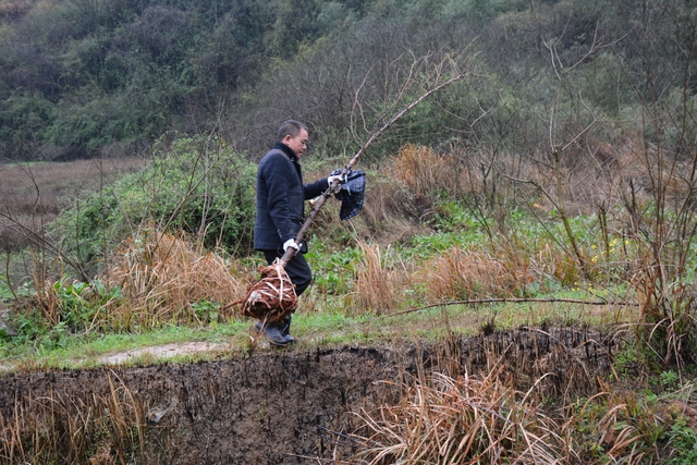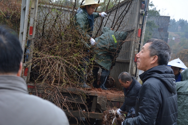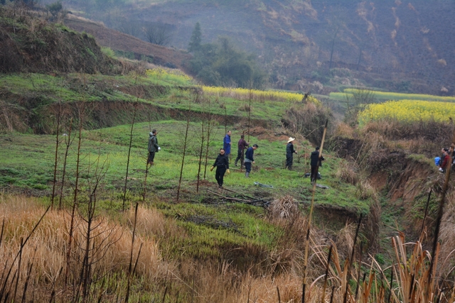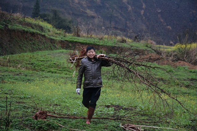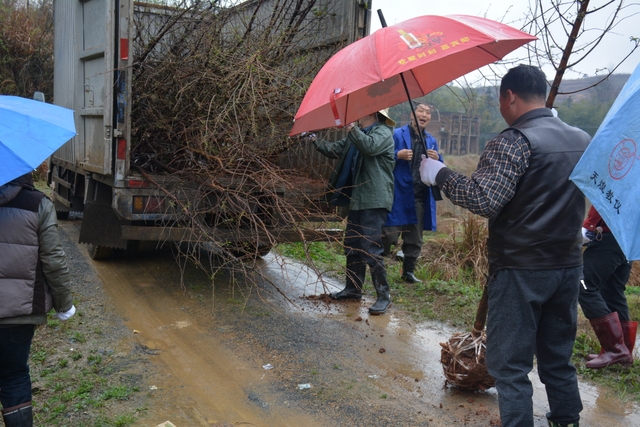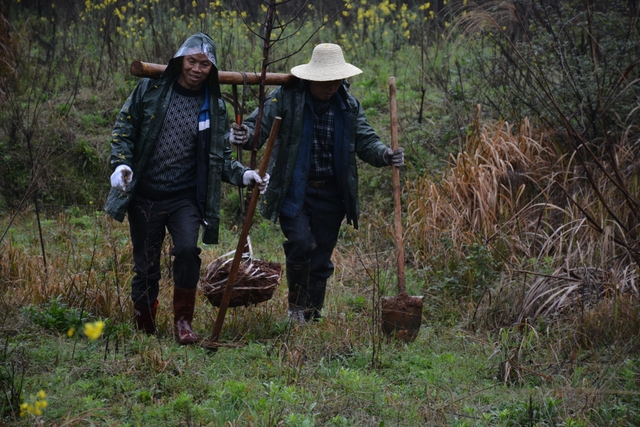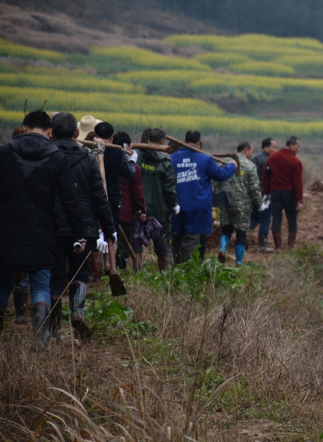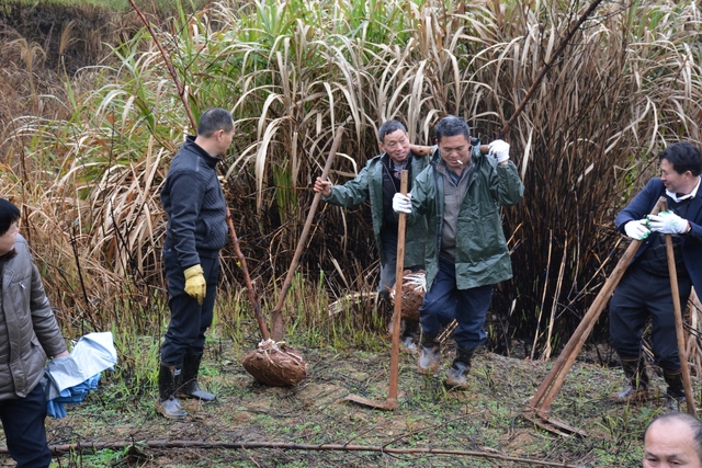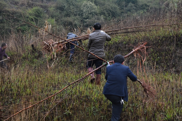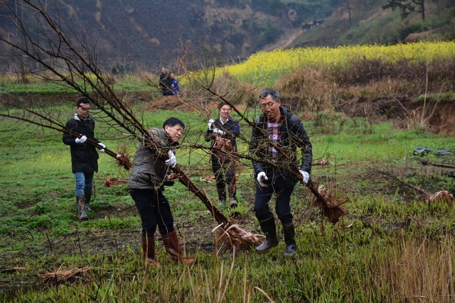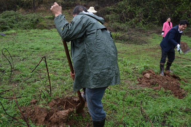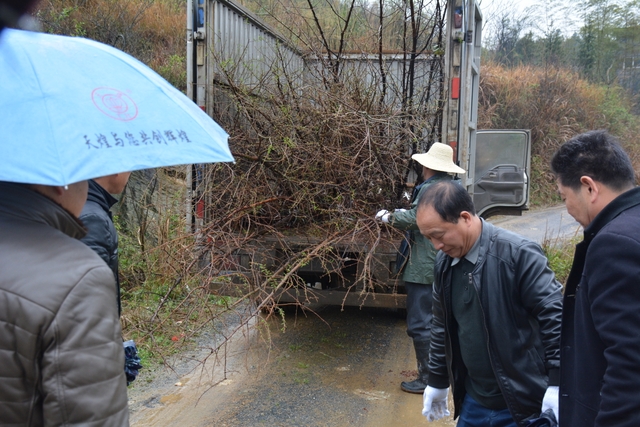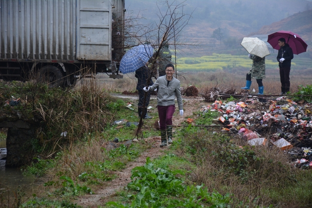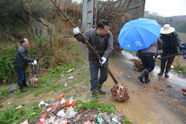 上午八点半,细雨蒙蒙。由三辆车组成的队伍从学校出发,经过一个多小时的颠簸行驶到达目的地。村主任欧阳小云等接待我们。寒暄之后,大家便开始工作,卸树,运树,栽树。货车不能开到栽树现场,还需走一里多路的羊肠小道。树苗带着包裹好的泥土,三五十斤重,枝枝杈杈的,不好操作。有的用肩扛,有的用手提,有的在地上拖,有的系上带子后两人一起抬。所幸雨住了。人们在泥泞溜滑的小道上往返三四趟才把树苗搬运完毕。尽管衣裤上沾满污泥,但大家没有任何怨言,劳动中充满欢声笑语,都对能参加这次劳动感到荣幸。