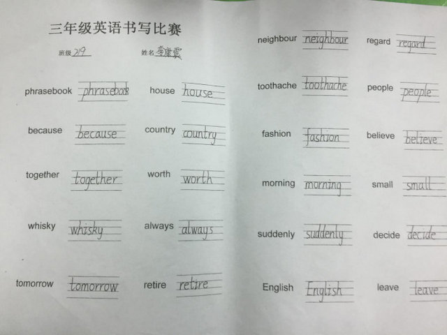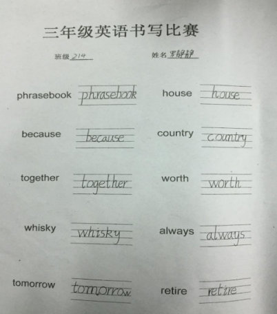 为了更好地促进学生的英语学习,增强学生的学习兴趣,规范英语书写,使学生的英语书写更加工整、美观,3月25日晚,小学部三年级英语组举行了英语单词书写比赛,三年级全体同学参加比赛。