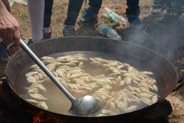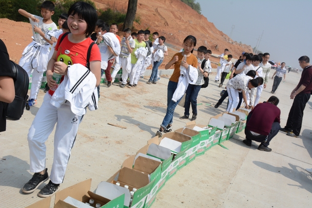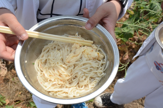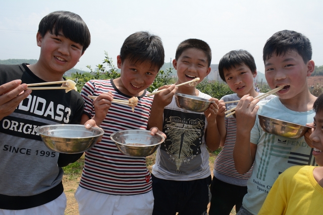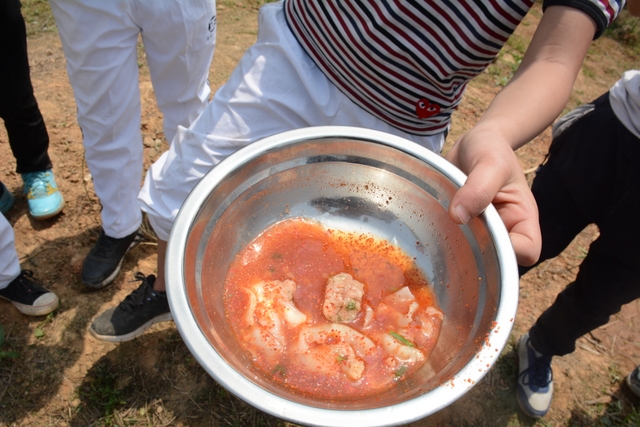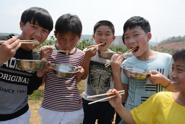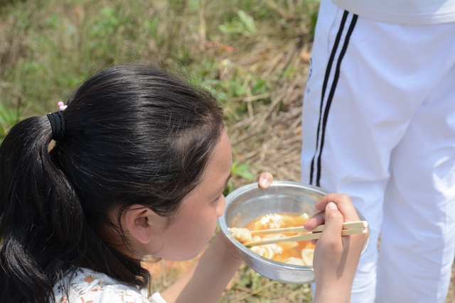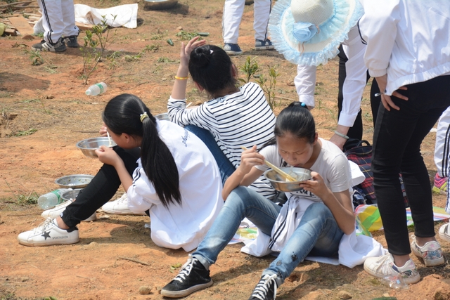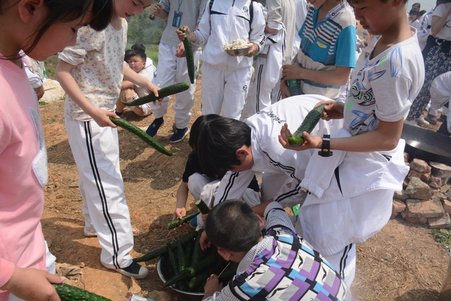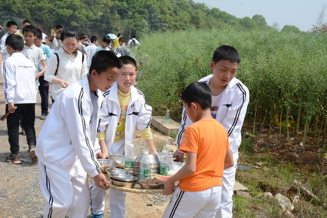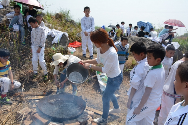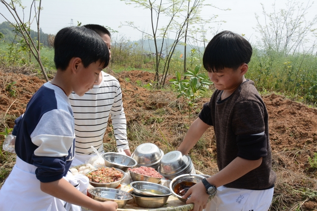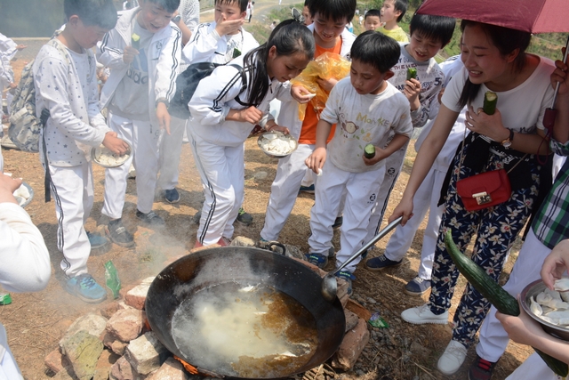 中午11点半,在距顺湖不远的新法院附近,同学们开始了他们的野炊活动。学校的供水车和食堂提供的食材早已在野炊地等候。这块野炊地我们学校上一次野炊活动用过,灶台大多完整,柴禾也剩下好多,真是好地方!看到现马现鞍,同学们兴致更高了。领餐具工具、提水、洗餐具、生火的、包饺子的、切黄瓜的、下面条的、忙得不亦乐乎。这群十一二岁的孩子们,还有那些刚从大学校园走上工作岗位的年轻的班主任,野炊对他们来说毕竟不是件容易的事情,笔者问一位年轻的女班主任:煮过饺子吗?她说,只吃过没做过。可是从他们身上并没有看到气馁,而是满脸洋溢着自信,有的同学竟然把辣椒灰也加入到饺子馅中,这种饺子在锅子里浮起来,是一抹淡淡的红,有点像溪水中徜徉的金鱼。一个小时后,师生们吃着自己亲手做的饭菜,心情真是一个爽!吃过饭,同学们用水浇熄柴火,冷却灶台,把垃圾清理干净,尽量恢复原貌。