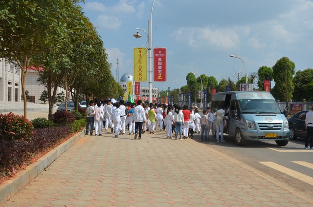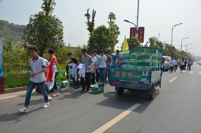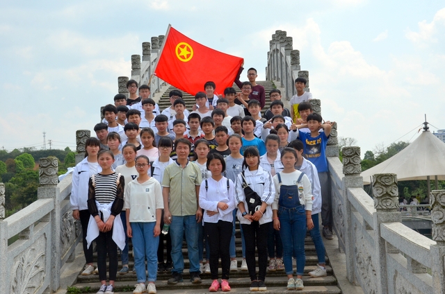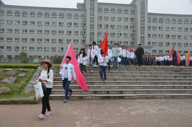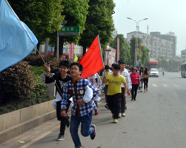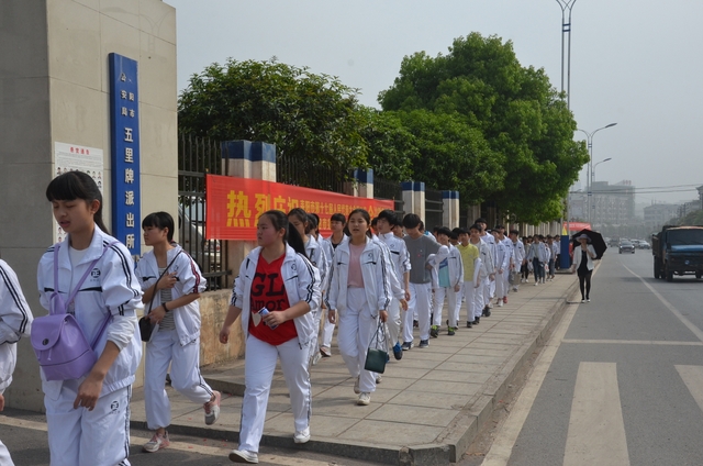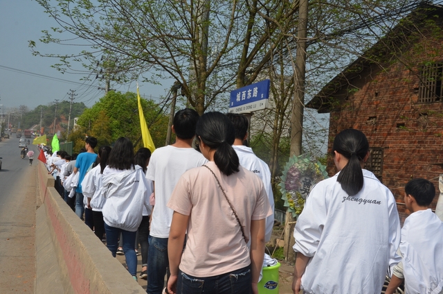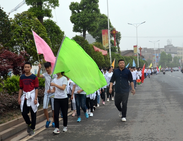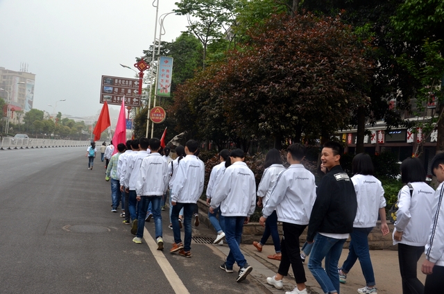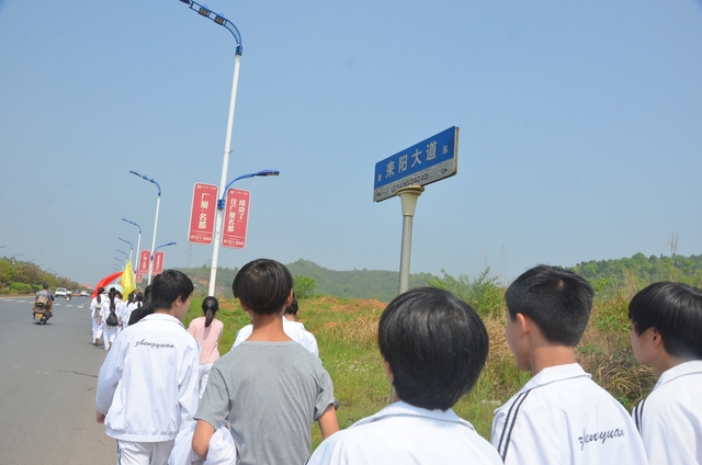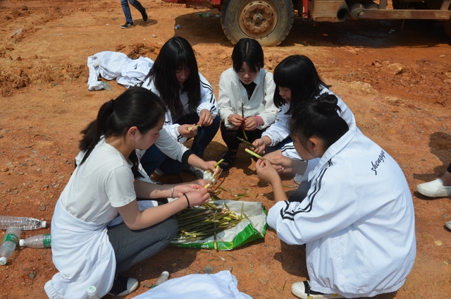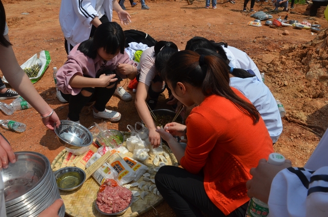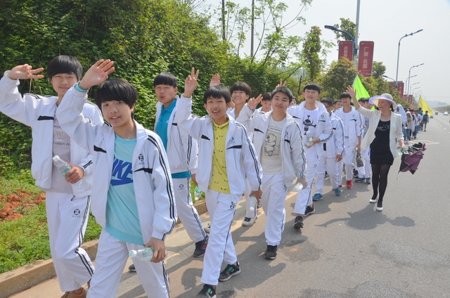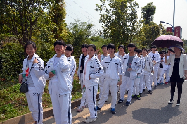 8点28分,以班为单位,各班跟班老师领头,班主任后压,学生两人一排,春游队伍浩浩荡荡从学校正门出发了。长龙蜿蜒几百米,同学们“若脱笼之鹄”,神采奕奕,步伐轻快而整齐。一路上,学校各部门为我们做了周密的部署,每个路口早有领导和交警在那疏通来往车辆,维持交通秩序,保证学生安全通过路口。沿途还设立了矿泉水发放点,以解口渴之忧。后勤部负责野炊用具及时到位。最终,临近顺湖的一块废墟成了我们野炊的阵地。