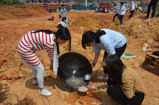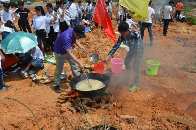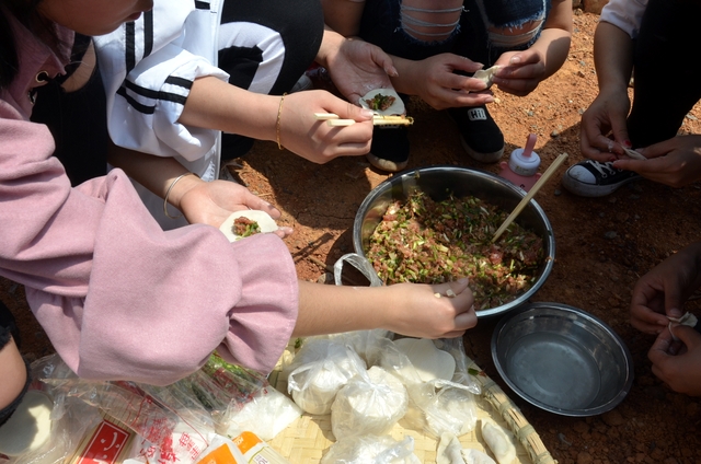 烈日毫无保留地释放着热量,却也挡不住同学们的高涨热情。进入阵地,各班人马开始分配任务。搬砖、垒灶、拾柴、烧火、提水、领食材、包饺子、下面条······分工合作,各展所长,一切井然有序,阵地上一派热火朝天的景象。“众人拾柴火焰高”,别看事情多而杂,在有序的安排下,只要大家齐心协力,就能创造奇迹。有在厨房久经磨砺的老师掌勺,也有初出茅庐的学生担当大厨。有手法熟练的老手一手捏一个饺子,也有聪明的学徒照葫芦画瓢。玲珑精致的饺子多,奇形怪状的饺子也不少。一簸箕饺子咕噜咕噜滚下锅,围在灶前的同学们已经垂涎欲滴。等到饺子一个一个浮出水面,嘿!好家伙。出锅啦!热气腾腾,晶莹剔透,煞是好看。咬开来,浓郁的汤汁溢满唇齿间,果然人间美味,不愧是我们这些“大厨”的杰作呀!更让人欣慰的是,一帮十指不沾阳春水的家伙也体会到了自食其力的乐趣。