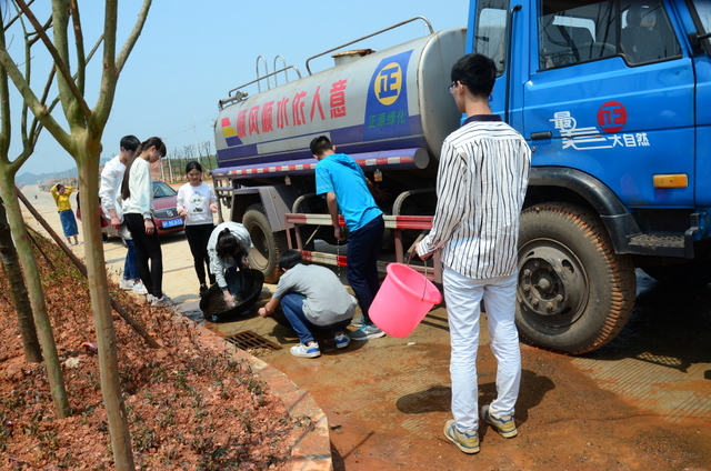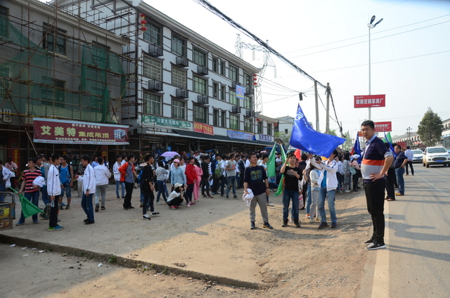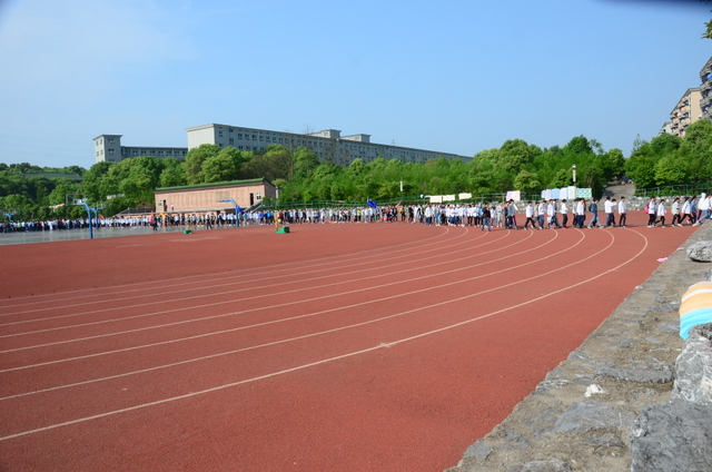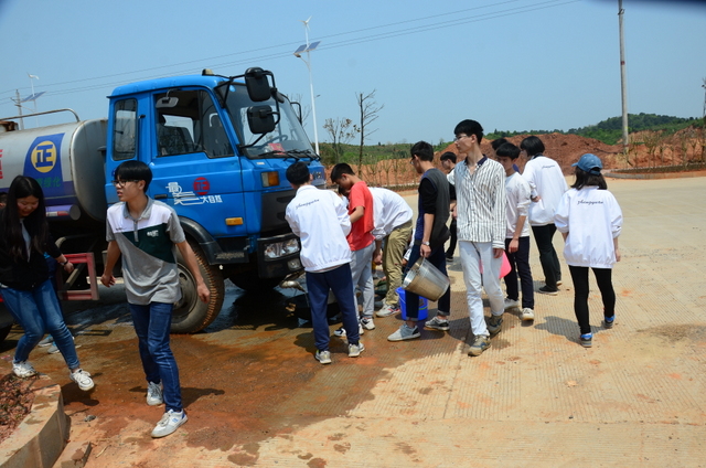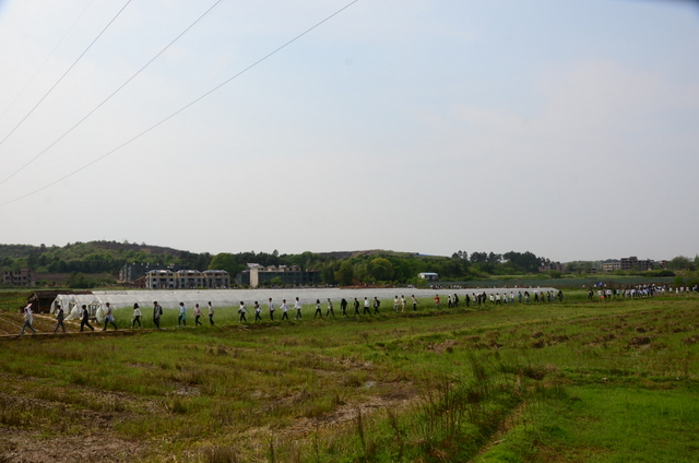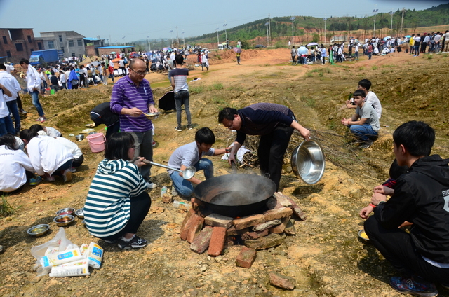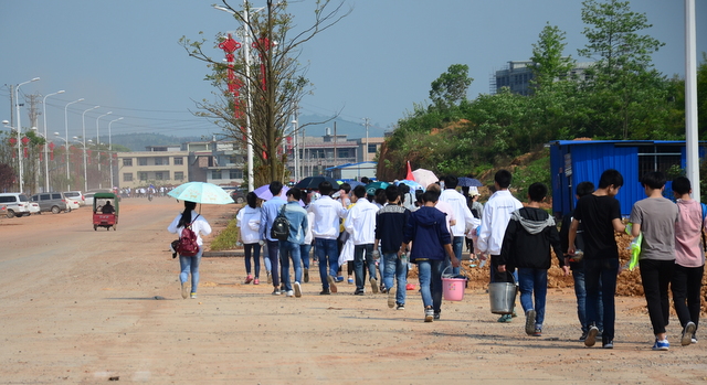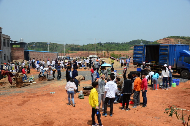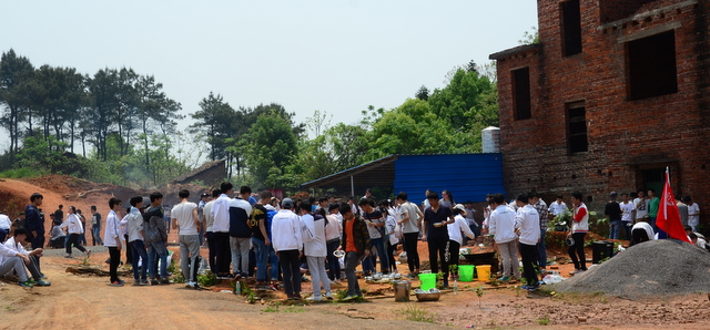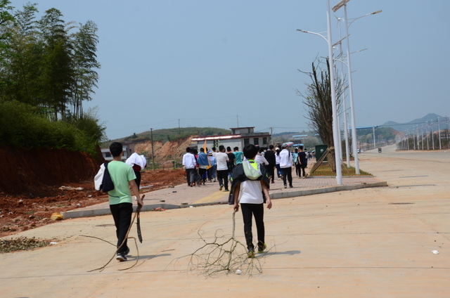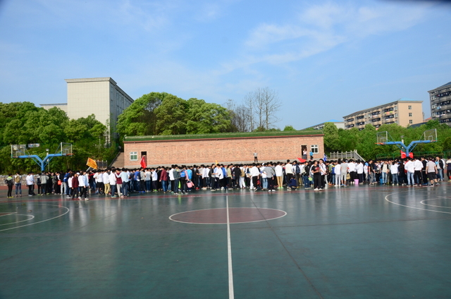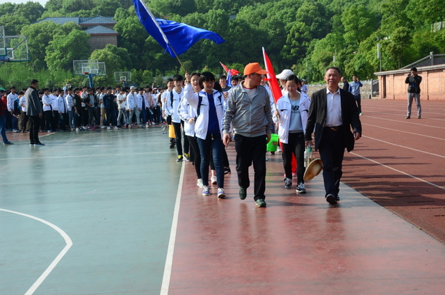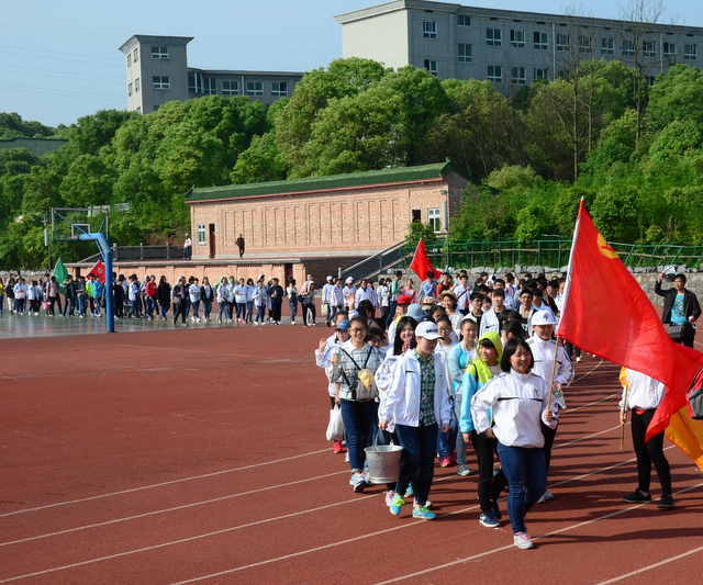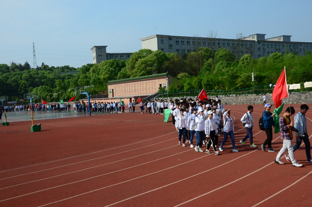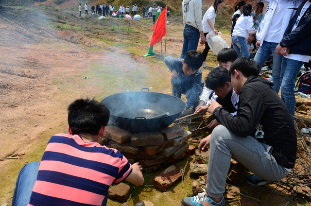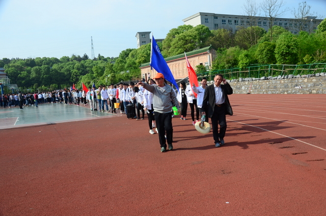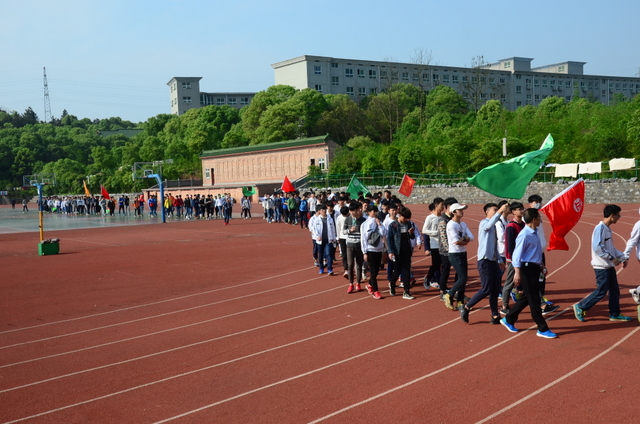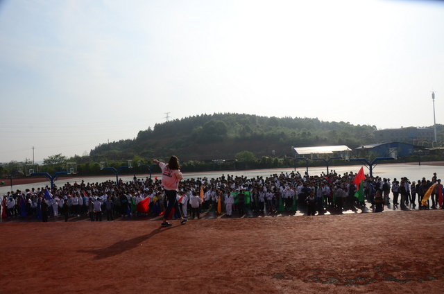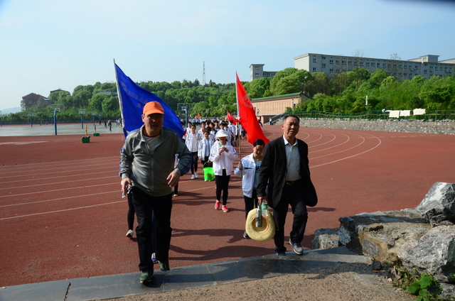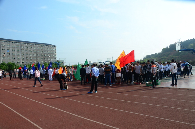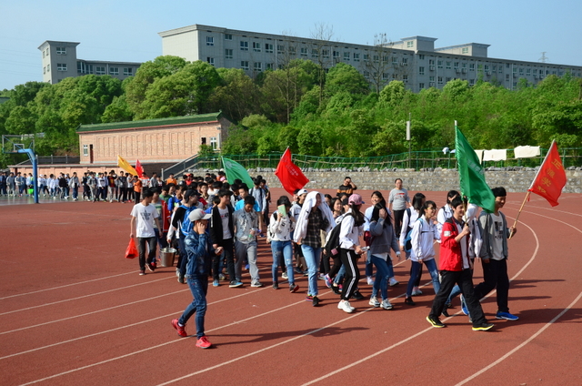 运动场上分外热闹,同学们按班级站好了队列,带上柴木、水桶,有的班的同学还带了鼓鼓的行囊。每班两面彩旗,借着狂劲的风飞舞,每人一瓶水分拨下去。有的人挎了包,有的人戴着帽,有的人一身轻,总之,每支队伍都充实了“粮库”,做好了远行的准备。