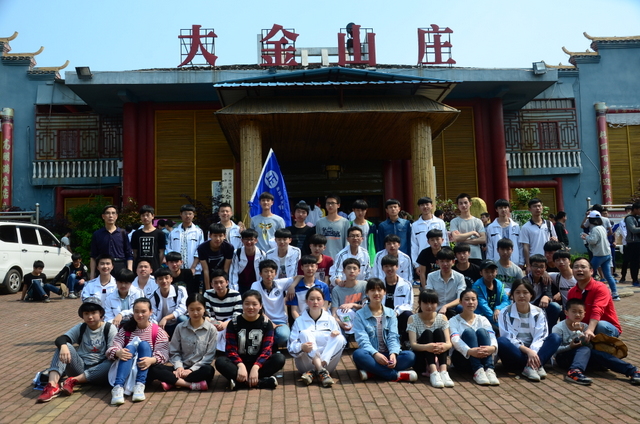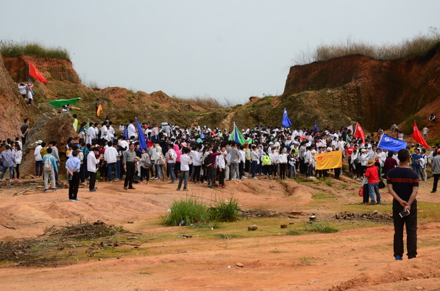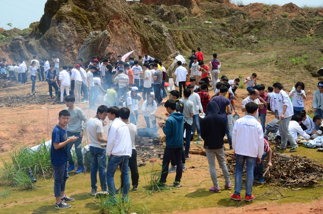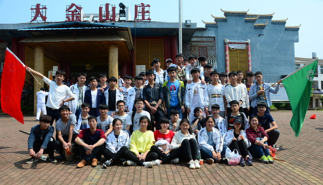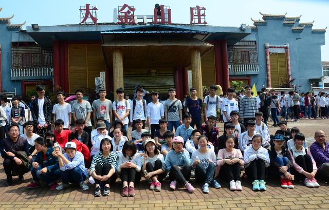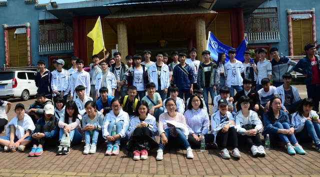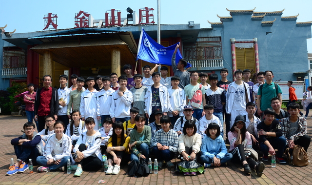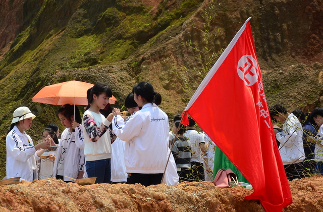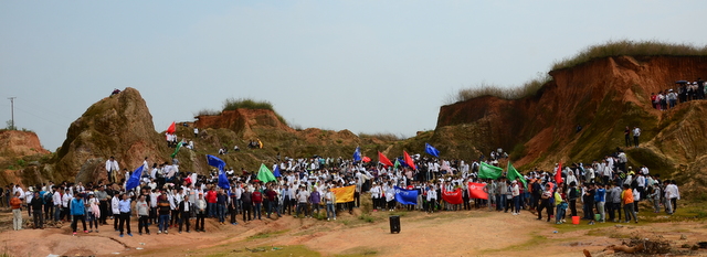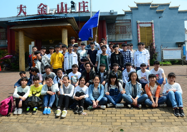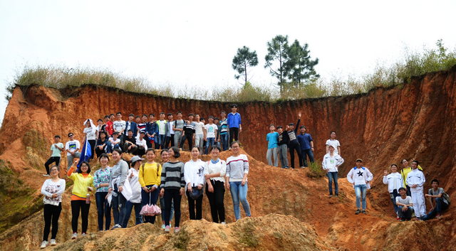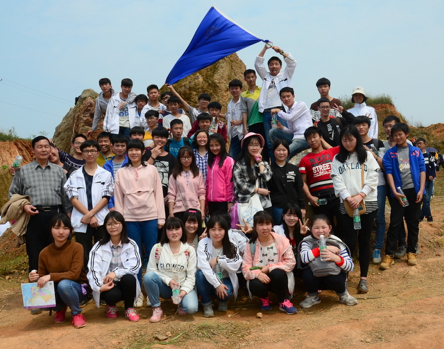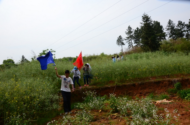 美景当然要作留恋。午餐后,大伙儿又忙着去找拍照的地方。后面的山,正是最好的地方,同学们自发地登山,拍照、摆造型,玩得不亦乐乎。上面站着一些人,其间有红旗飘扬,下面的人要抬头仰望。另一座山头,有人直接攀到了山顶,扬起班旗。大概真的能够得到“会当凌绝顶,一览众山小”的乐趣。