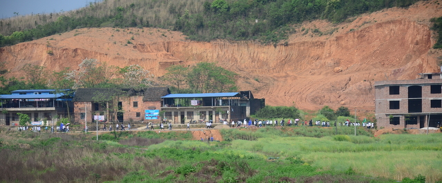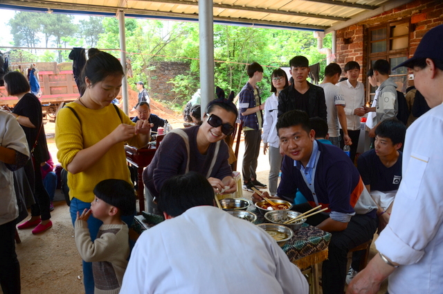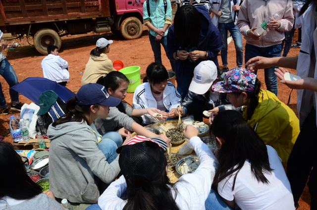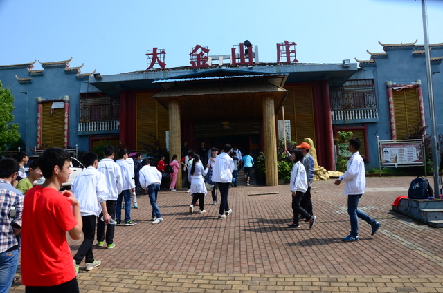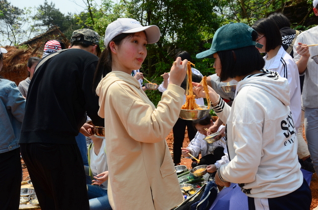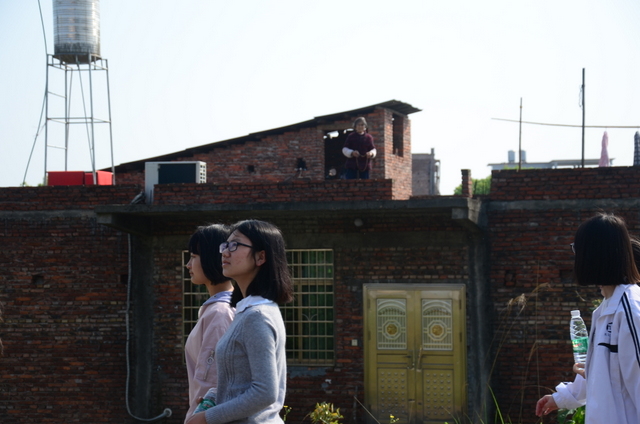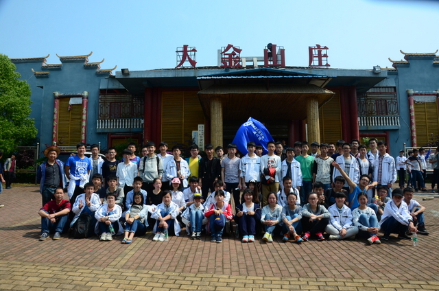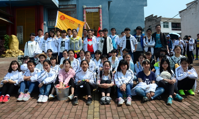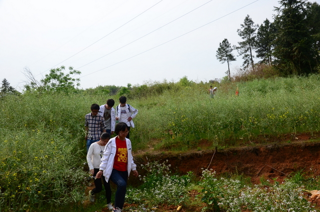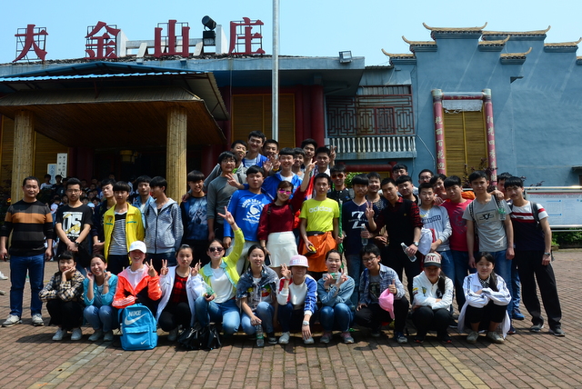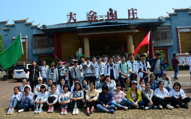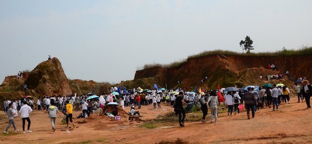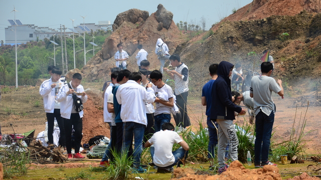 美景当然要作留恋。午餐后,大伙儿又忙着去找拍照的地方。后面的山,正是最好的地方,同学们自发地登山,拍照、摆造型,玩得不亦乐乎。上面站着一些人,其间有红旗飘扬,下面的人要抬头仰望。另一座山头,有人直接攀到了山顶,扬起班旗。大概真的能够得到“会当凌绝顶,一览众山小”的乐趣。