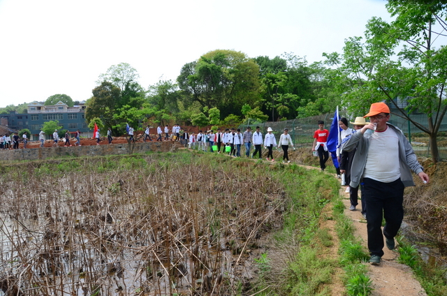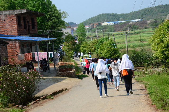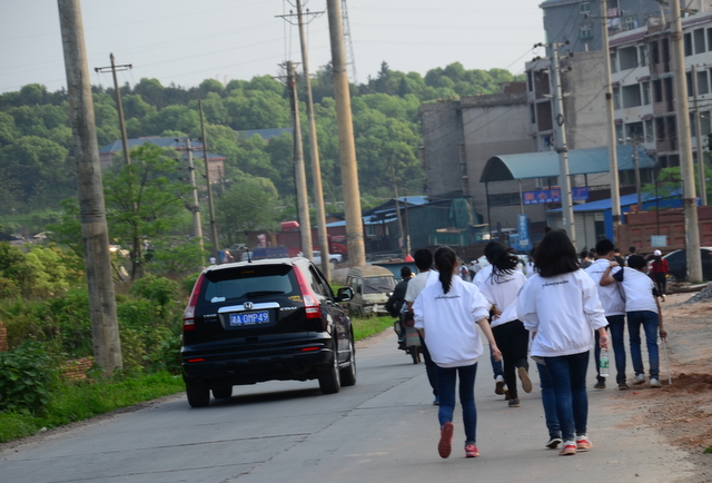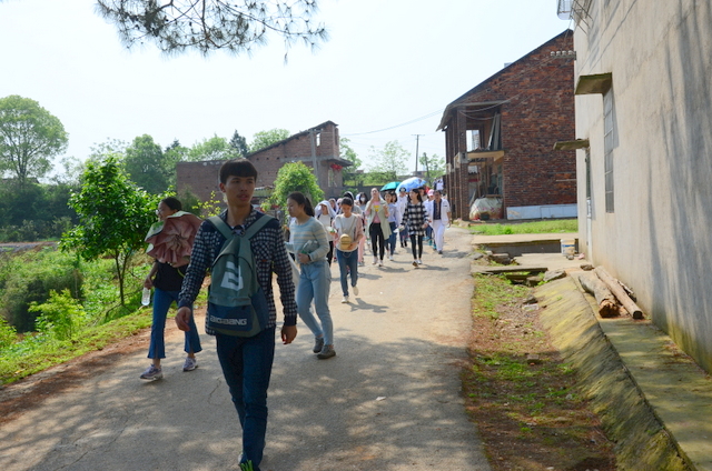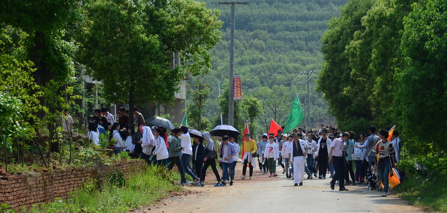 第一个休息点是在耒阳市蔡伦科技园所在地——大金村,这里是湖南省新农村建设的示范村,风景优美,绿树成荫,是休息的好地方。有的同学向附近的人家借座,有的在树下乘凉,这时候人群又热闹起来,好奇的凑前看,原来是有同学在现场,手里拿着“小蜜蜂”正在献唱。和着歌曲,毫不胆怯,自信张扬。当真是有明星风采。