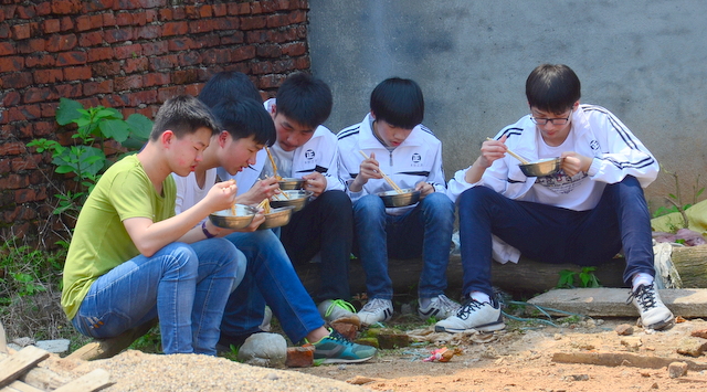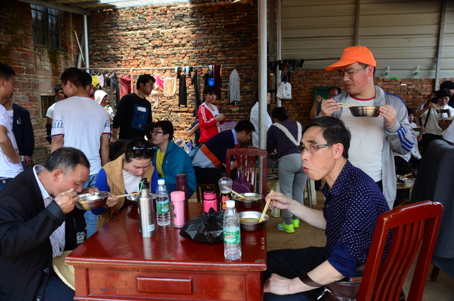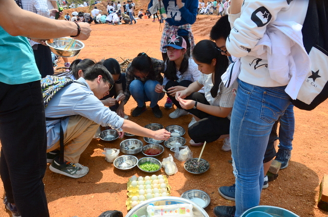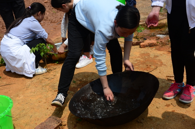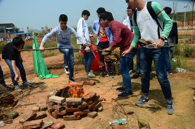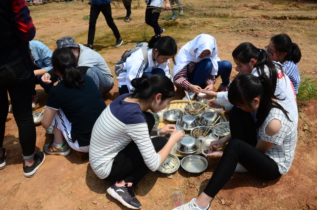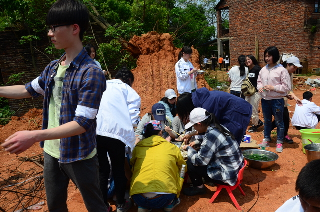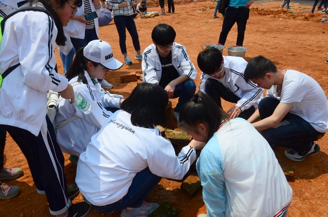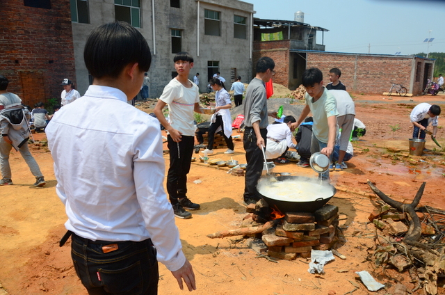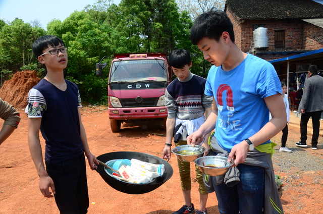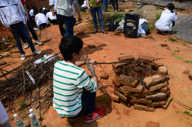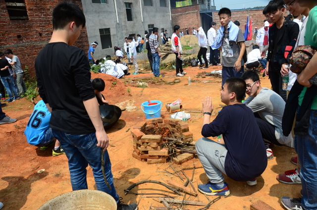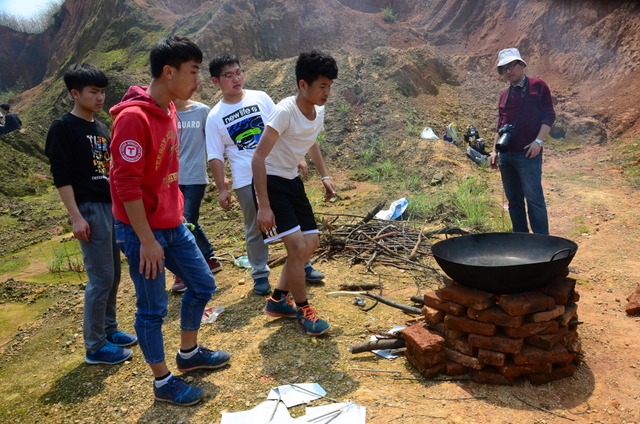 先是搭灶,这时候上场的是经过两次远足锤炼的熟手,屋舍边有板砖,先搬上一堆,搭灶手就开始画圆,有的红砖爬满了青苔,这样的砖其实不好搭灶,容易打滑,于是用别的砖打磨掉一些。再像拼图一样,有规律地穿插摆放,层层上叠,最后一层一定要稳。午餐能不能做好,这就是基础了。