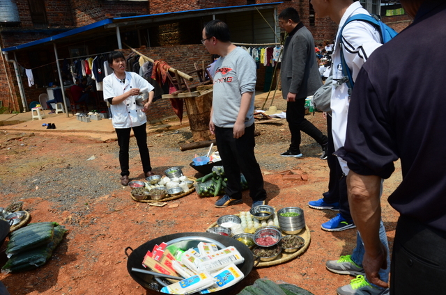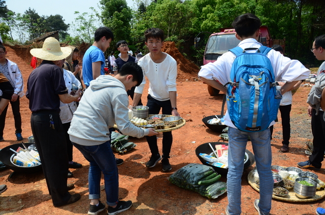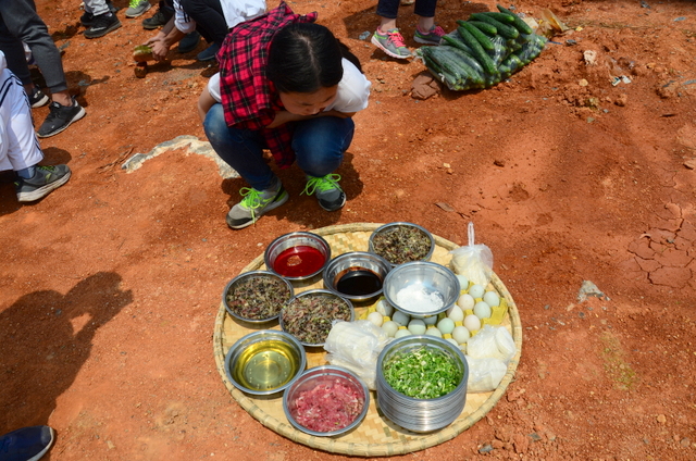 食堂的工作人员在地上摆开一地食材,中午的伙食是面条和饺子。每个班先观察地形,选择“据点”。再把这一筐食材抬回去。各班按照各自的分工,开始“上岗创业”。