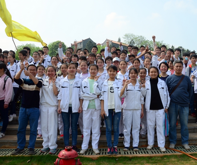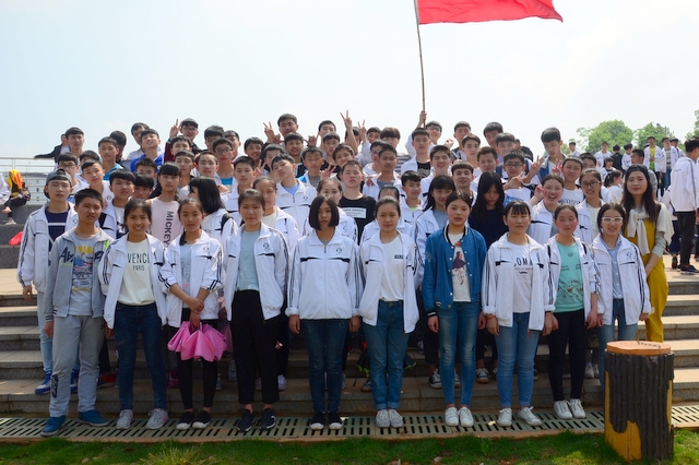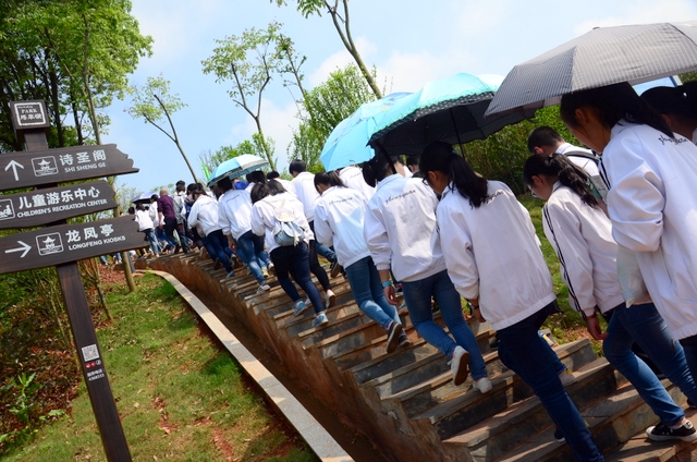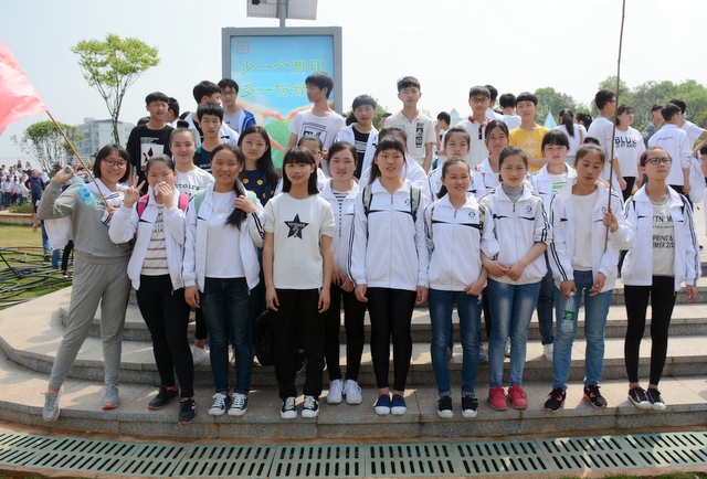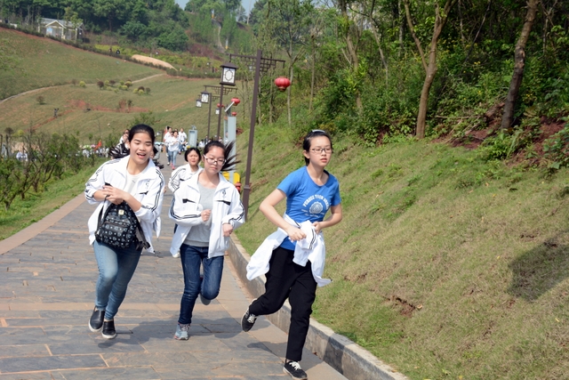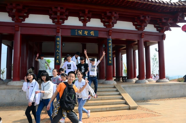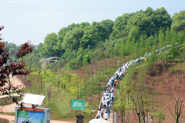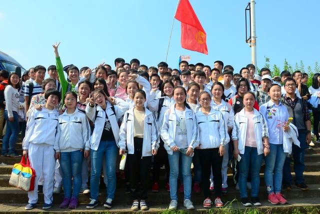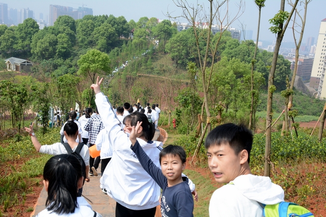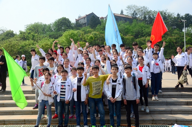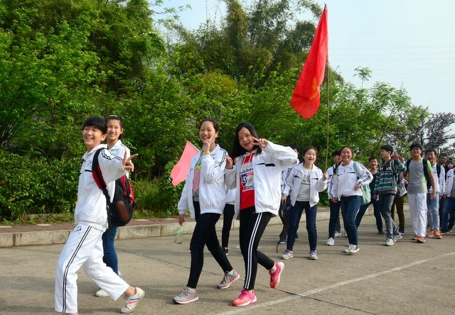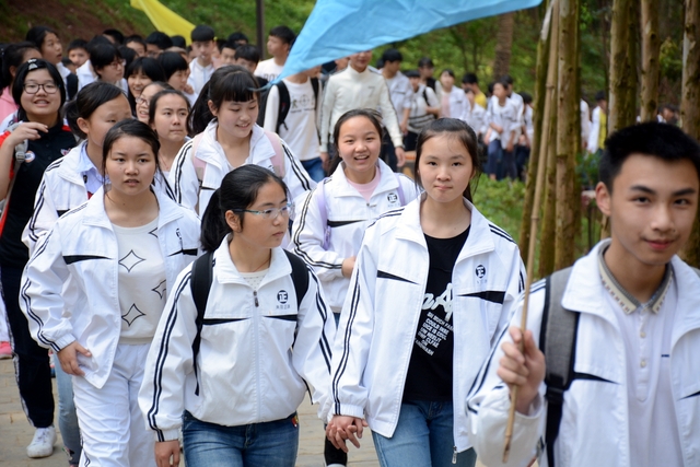 9点20分,第一面飞扬的红旗抵达马阜岭。同学们的白色校服在阳光下十分耀眼,1400多名学生组成的长队,宛如一条忽现人间的白龙,气势磅礴地在山间跃动。来到“诗圣阁”上,我们领略了“会当凌绝顶,一览众山小”的诗意。稍作停留,就沿着公园盘曲的山路,迎风而上,直至耒阳城区最高点——普贤寺。我们到达时,那里已经有幼儿园的小朋友在做早操,伴着欢快的音乐,小朋友蹒跚作舞,引得我们大朋友也翩翩起舞。