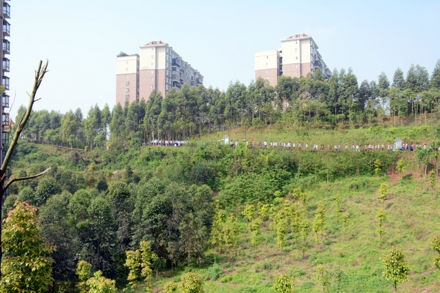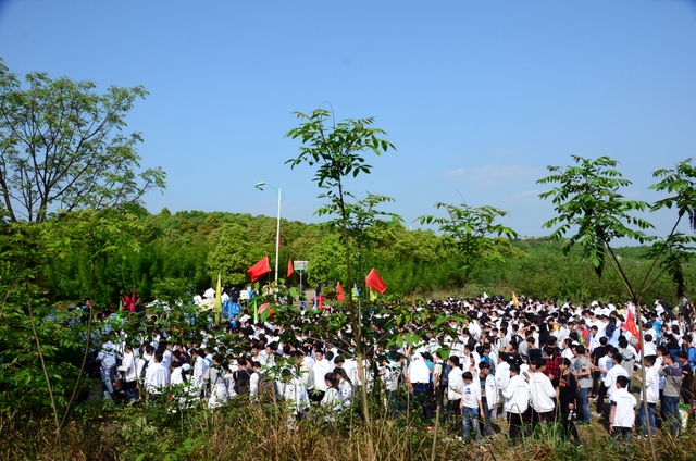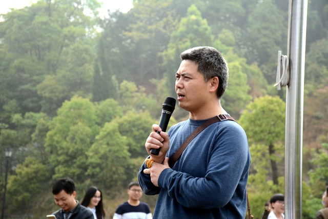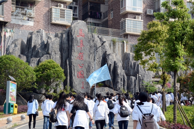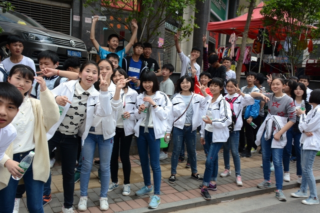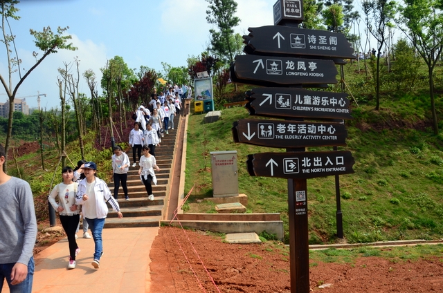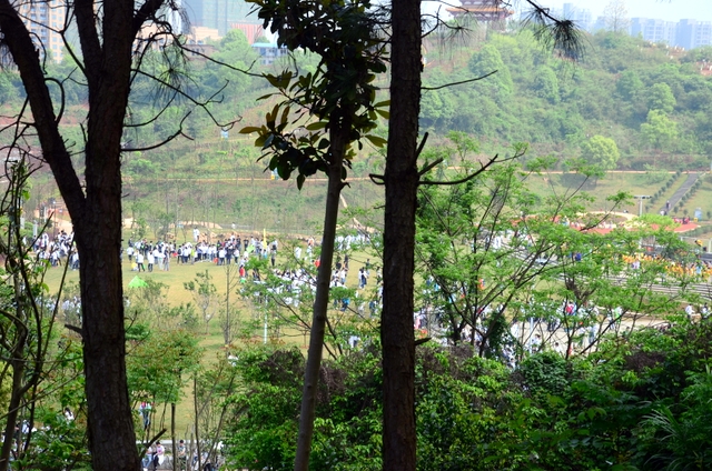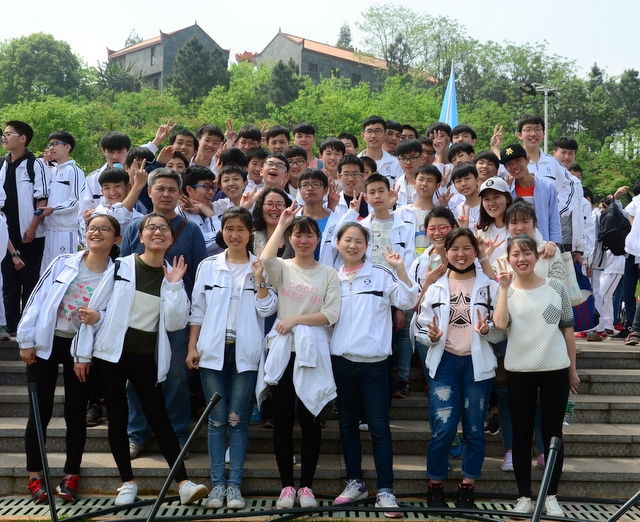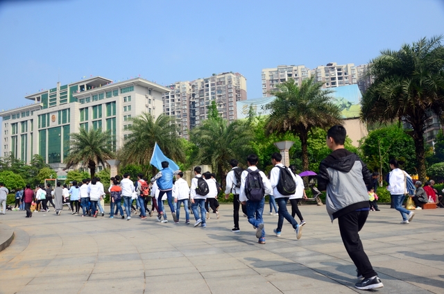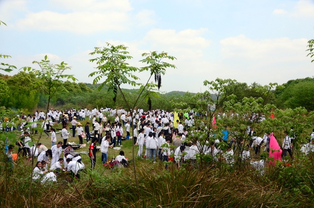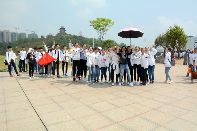 9点20分,第一面飞扬的红旗抵达马阜岭。同学们的白色校服在阳光下十分耀眼,1400多名学生组成的长队,宛如一条忽现人间的白龙,气势磅礴地在山间跃动。来到“诗圣阁”上,我们领略了“会当凌绝顶,一览众山小”的诗意。稍作停留,就沿着公园盘曲的山路,迎风而上,直至耒阳城区最高点——普贤寺。我们到达时,那里已经有幼儿园的小朋友在做早操,伴着欢快的音乐,小朋友蹒跚作舞,引得我们大朋友也翩翩起舞。