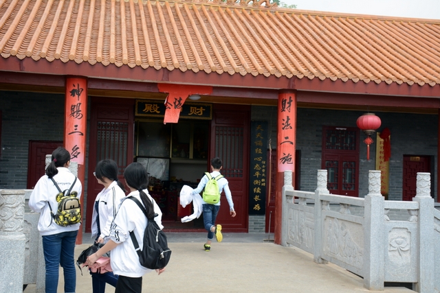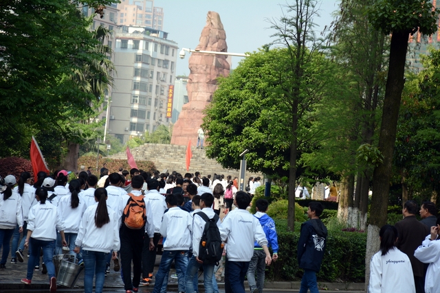 远足队伍从巍峨的神农帝塑像旁经过