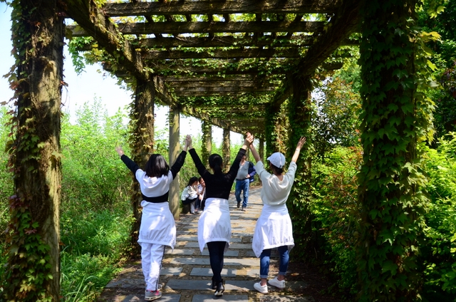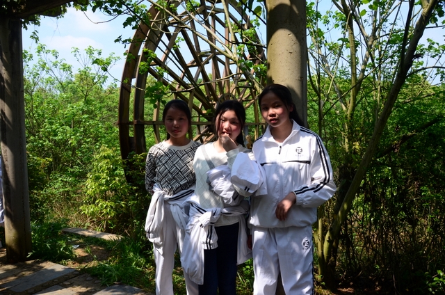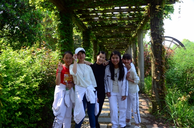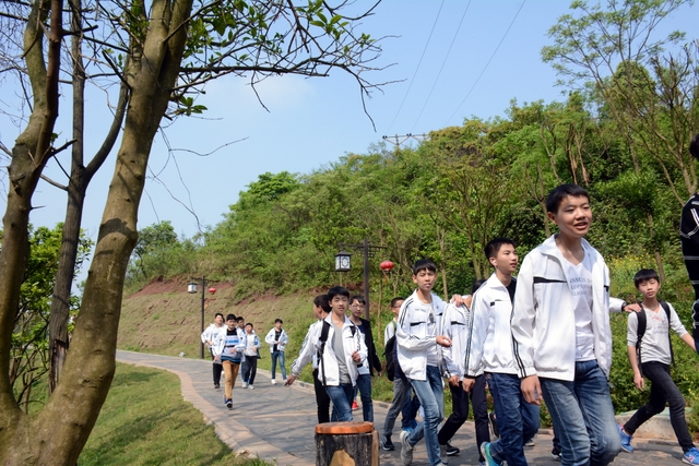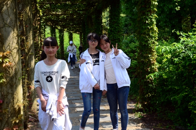 太阳越来越大了,天气越来越炎热了,体力开始下降了,第一次参加远足的同学感到辛苦了,害怕了。老师说:“路漫漫其修远兮,吾将上下而求索。”同学们说:“天将降大任于斯人也,必先苦其心志,劳其筋骨,饿其体肤,增益其所不能。”……终于,“蔡伦农业科技园”几个金光闪闪的大字映入我们的眼帘,一踏入大石柱门,就仿若走进了另一个世界——绵延的山被一片诱人的绿覆盖着,在远处摇曳着动人的身姿;小路两旁站立着许多高大的树,枝桠在微风中挥舞着,仿佛是在迎接我们的到来。山脚边的绿色长廊被一圈圈的葡萄藤环绕着,人在其中,仿佛置身于深深的绿中。刚才的炎热瞬间消失了,每一丝空气都带着凉意;时间在这里停止了,每一秒都带着花香,让我们贪念。