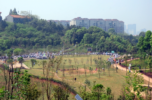站在普贤广场,耒阳风光尽收眼底:数不清的高楼大厦拔地而起,新建的耒阳大桥车水马龙,清澈的耒水静静地从马阜岭脚下流过;远望处,耒阳电厂的天空已经干净了,连绵的山峰在薄雾中若隐若现……大家先是欢呼,然后欣然留影。
