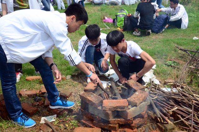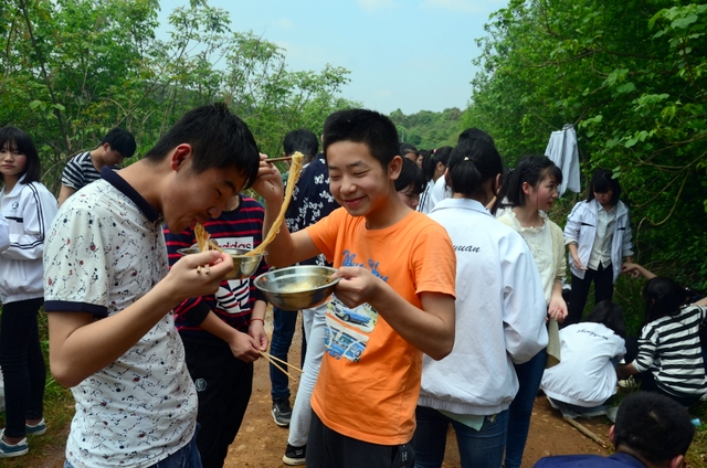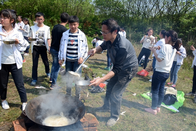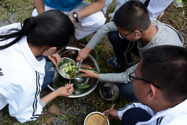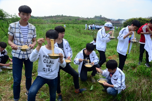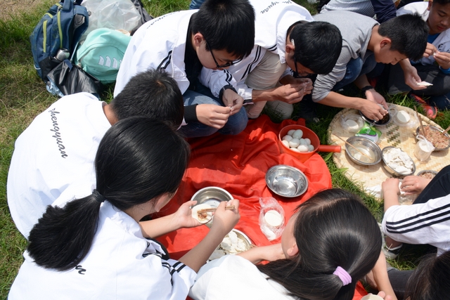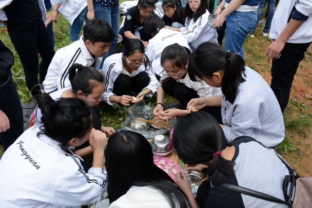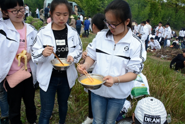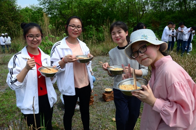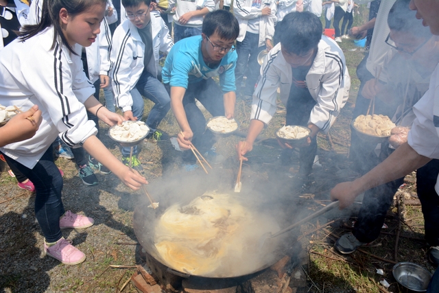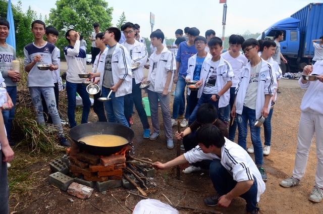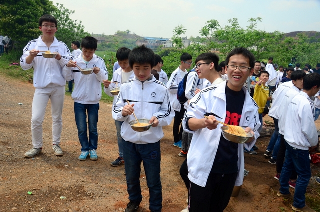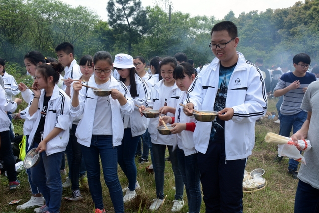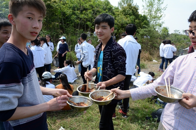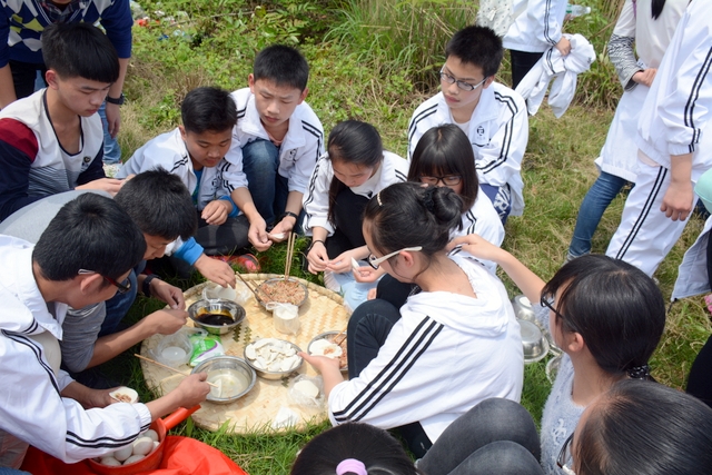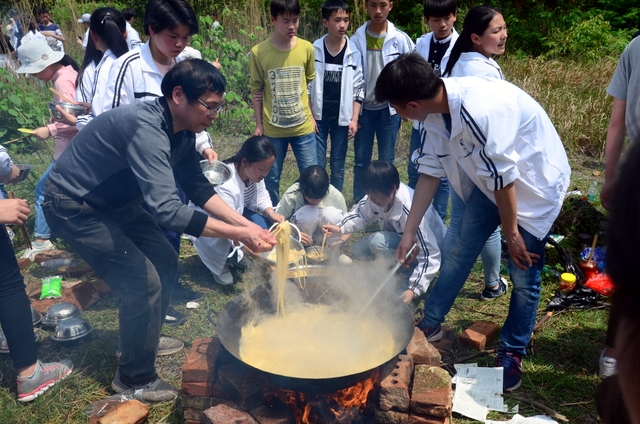 漫长的跋涉后,同学们抵达了野炊地点。说干就干,同学们撸起袖子就来:同学们各司其职,食材组排队领食材和炊具,柴火组就近拾捡柴火,男生们打水、垒灶、生火,女生们则洗碗刷锅。很快,大家围成一圈,开始包饺子。我们都是“老游客”,很多同学娴熟地包出一个又一个可爱的饺子,也有些同学左看看,右问问,笨拙地学习,即使不会也仍不放弃表现一番。大家其乐融融地忙活着,好似有使不完的劲。一切都准备就绪后,食材组掌勺下面条和饺子,也有老师亲自下厨。面对着炎热、火焰、浓烟,我们没有半句怨言,都围着锅,纷纷递食材佐料,生怕自己帮不上忙。终于,面条出锅了!同学们都乐呵呵地捧着手里的碗,大口大口地吃着。“虽然过程是艰难漫长的,但在大家的合作下,什么困难都显得微不足道。”1601班刘志华同学感慨道,“我深深体会到了父母日复一日为我们做这些家庭琐事的辛劳……”