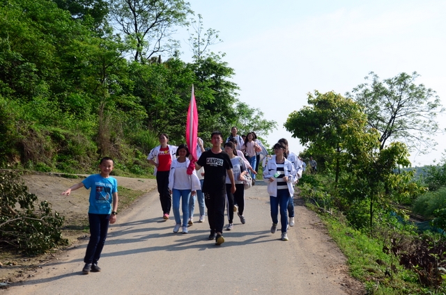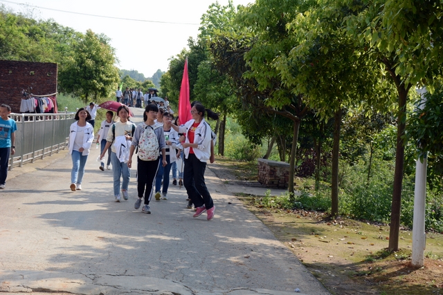 “日落夕山红霞飞,战士打靶把营归,把营归……”悦耳的歌声又点燃我们的热情。在盘曲的山路上,一位老爷爷,看见我们的长龙后开心地笑了,大声地对着我们喊出:“好好学习,天天向上!”阳光照在同学们红彤彤的脸上,大家一路高歌,嘹亮的歌声在乡村小路上飘荡。