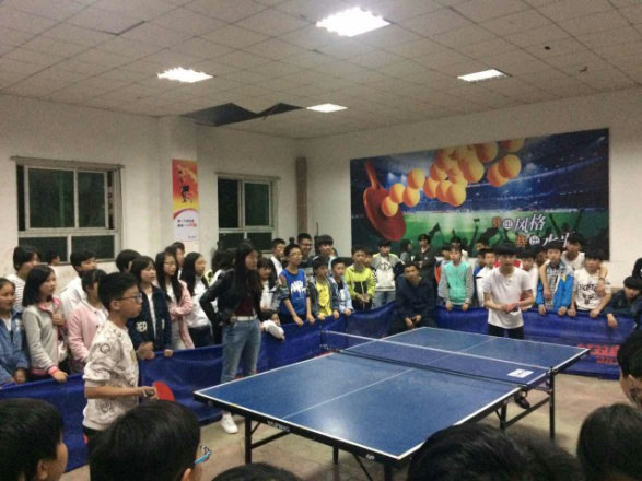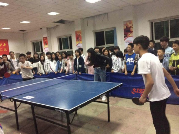 为贯彻执行罗校长教育理念,发展学生体育运动,初一年级乒乓球比赛第四轮初赛于4月12日下午6:50准时开始,团体赛比赛队伍首先上场的是303班VS302班。在这场比赛中双方的选手们你来我往,打得热火朝天;场边啦啦队员们的助威声更是一浪高过一浪。经过紧张激烈的五场比赛,最终303班以3:2的比分战胜302班。
