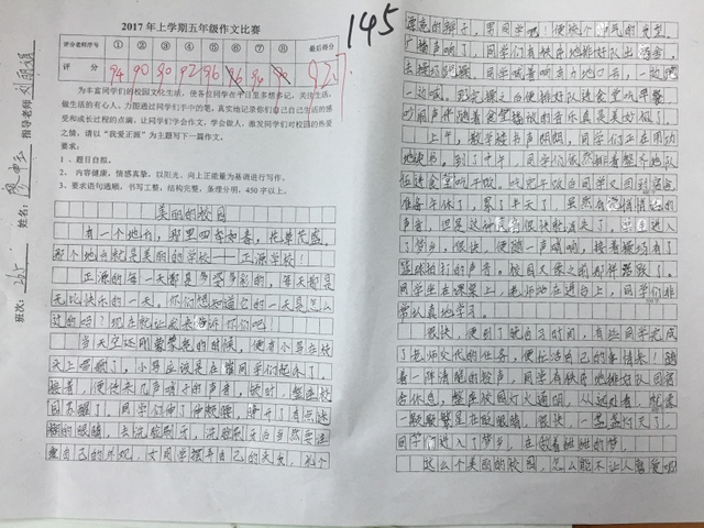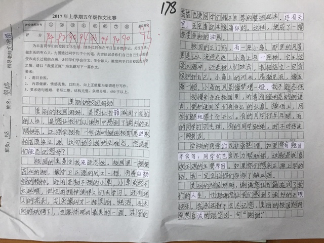 本次活动由五年级全体学生参加,分为初赛和复赛。依照竞赛规则,各班在规定的一小时内进行初赛,孩子们认真思考,从不同角度、不同层面,把自己的所感所想,充分地展现出来。初赛之后,由各班语文老师选取百分之二十的优秀作品参加年级复赛。在语文备课组长陈兰芳老师组织下,五年级全体语文老师,将所有参加复赛的作品予以评分,每份复赛作文由八个语文老师流水评阅。经老师们认真审评,评出优秀作品63篇,其中一等奖11篇,二等奖22篇,三等奖30篇。