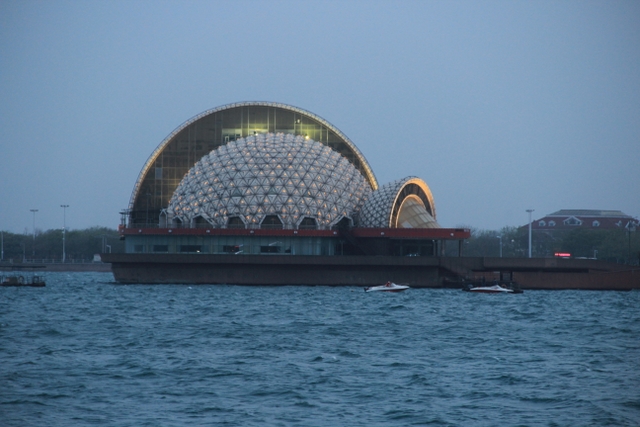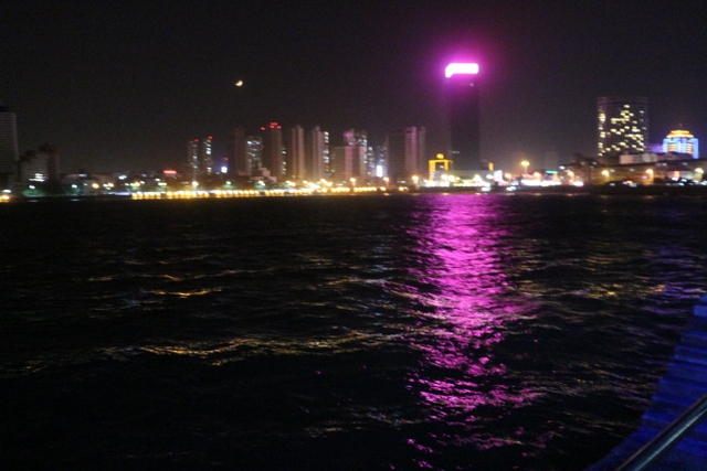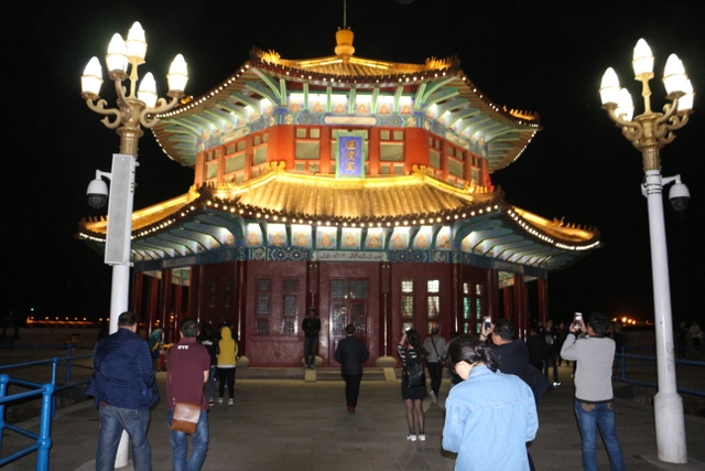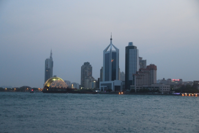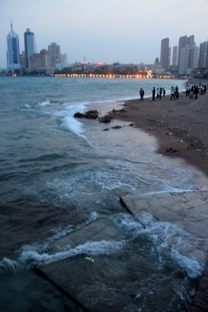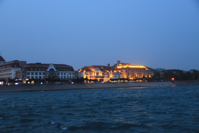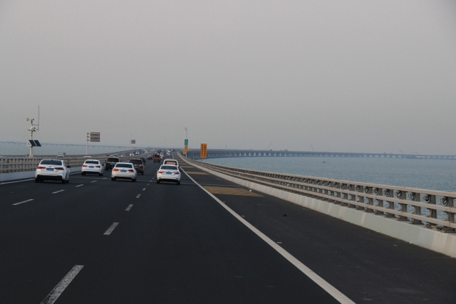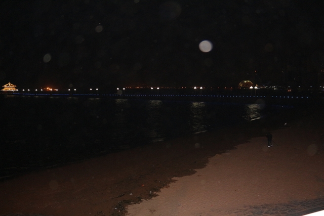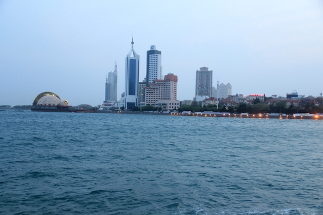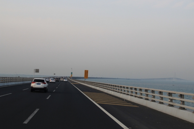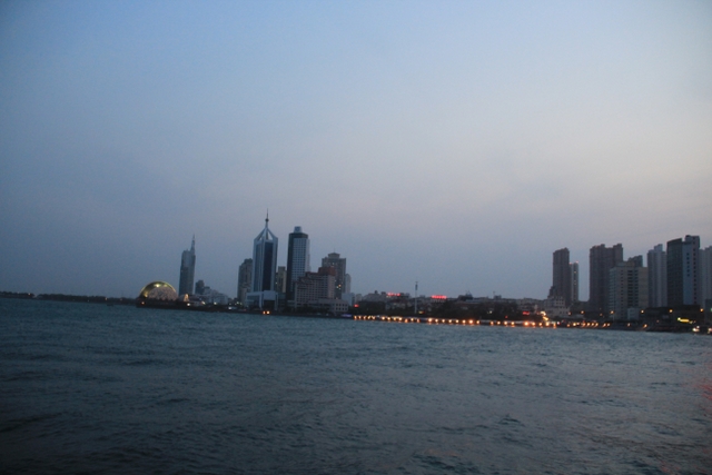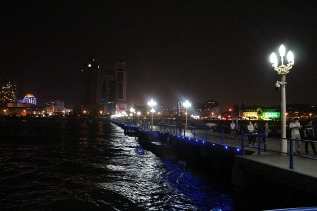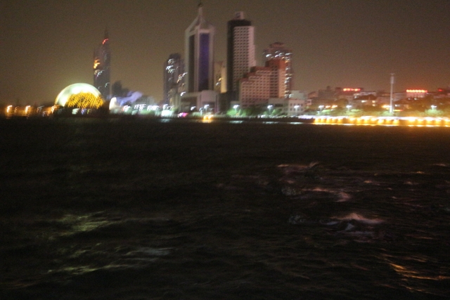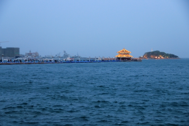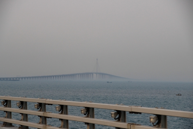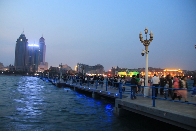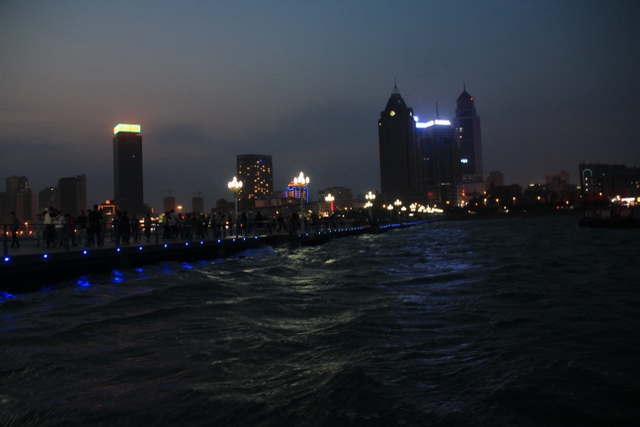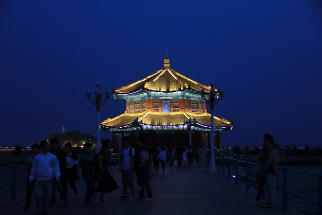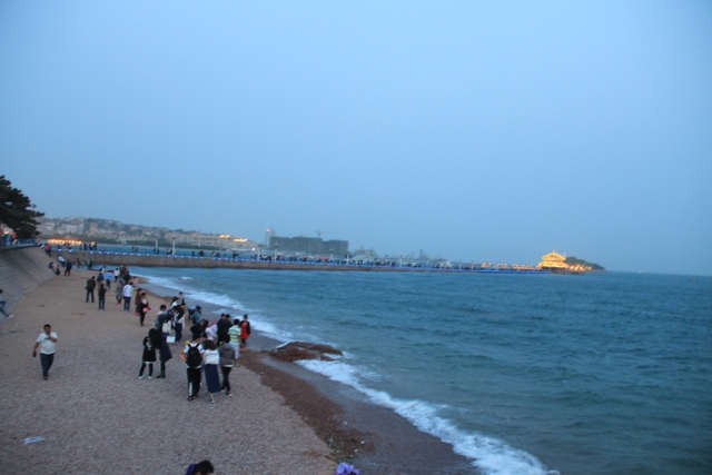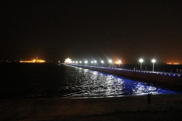 晚上八点四十分,汽车驶上胶州湾大桥。这是迄今世界上已建成的最长的跨海大桥,全长36.48千米,比前任“冠军”杭州湾大桥长0.48米,超过了美国的切萨皮克大桥。一线如练,在远近灯光的映照下,给人以如梦似幻之感。随即游览了青岛栈桥,它是青岛近代历史的见证,也是青岛的象征。