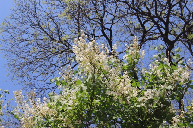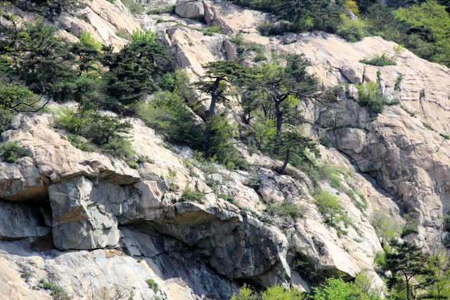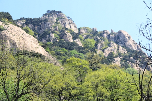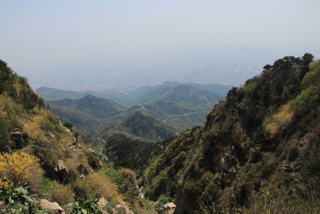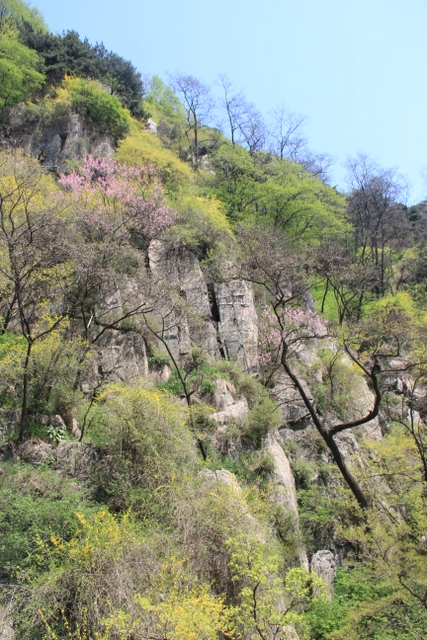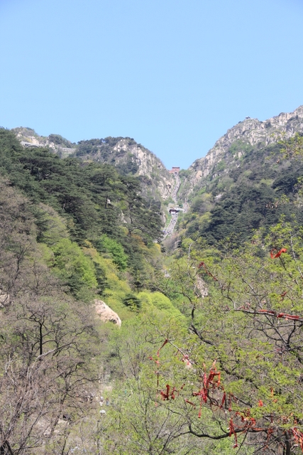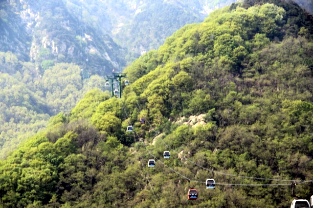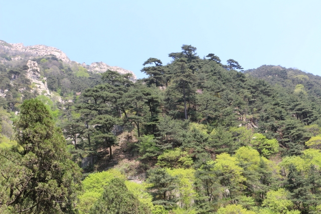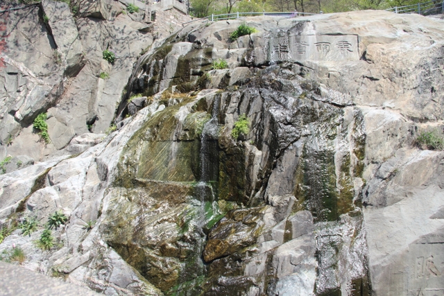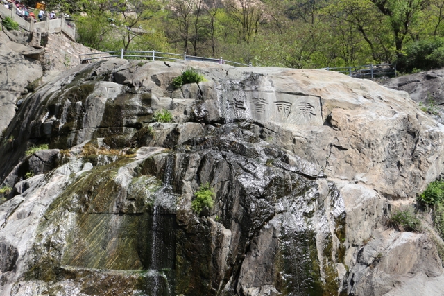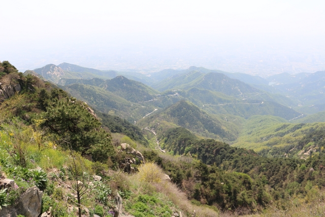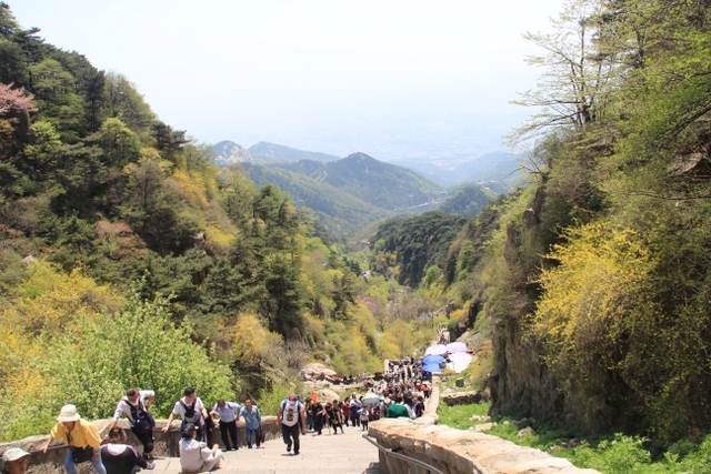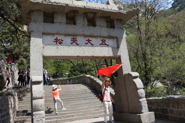 乘坐旅游车从入口处出发,一路盘旋上山,路虽崎岖,给人的感觉却一点都不辛苦。虽已进入五月,但随着海拔的升高,道路两旁各种树木的花朵逐渐增多,借助风的力量,细小的花瓣漫天飞舞,给暮春的泰山增添了几分诗情和画意。有道是:“人家四月芳菲尽,山寺桃花始盛开。”泰山之麓,百花绽放,生机无限。