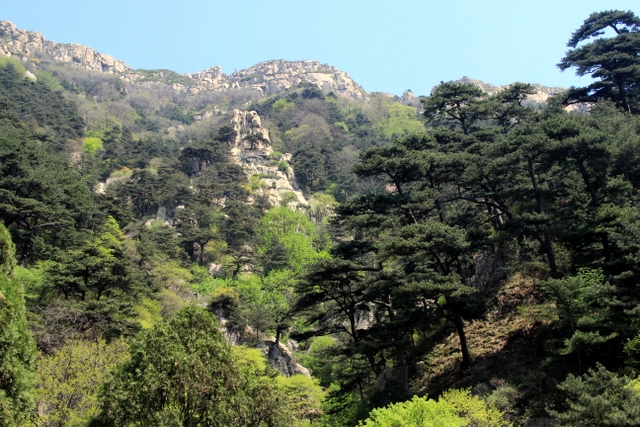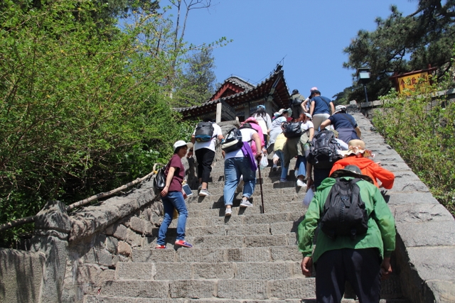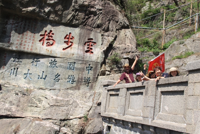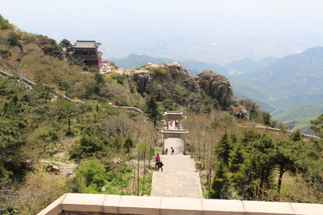 约莫20分钟,旅游车到达中天门,由此步行上山,依次经过“快活三”、云步桥、五大夫松、望人松、朝阳洞等,登上十八盘,就到达南天门。