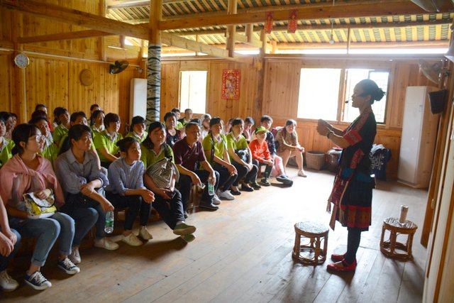 阿嫂说,侗族人的卧室不允许参观,与我们汉族人不同,他们的卧室只有一间,床与床之间相连,就像我们所说的大通铺。侗族老人说,床不能用木板隔开,那样会把人心隔开。因此,侗族人睡觉都是在一间房内,他们不说隐私,家人之间都是坦诚相见。在侗族,地位最高的就是家中的老人,这里的人崇尚尊老爱幼,在吃饭时,一定是老人先吃,大家从小就牢记要尊老敬老,也是为自己积福。听着阿嫂给我们讲爱老敬老的故事,大家心内都有些感慨,纷纷表示,回去之后,一定要将尊老爱幼这一中华民族传统美德,言传身教,让下一代去学习传承发扬光大。