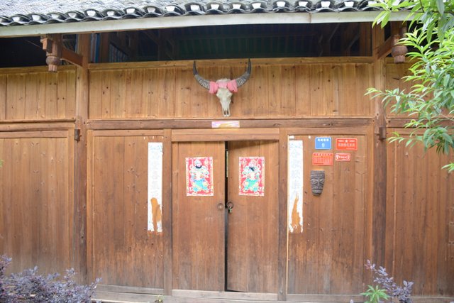 我们来到了最后一站——侗族大寨。村子里的阿嫂告诉我们,在侗族,只要家中有100岁以上的老人,他们就会在门前挂上一个牛头,意喻积福。在侗族人的心中,第一信仰是神灵,第二信仰就是毛主席,因此,在不少侗族人的家中都还挂有毛主席的画像。老师们边走边看,对侗族文化充满了好奇。
