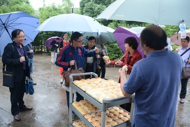 路过学校面包房时,刚好一位师傅推着刚出炉的新鲜面包出来。罗校长招呼客人们尝尝。开始客人们还有点绅士、淑女,几个人分着尝一尝。待尝过之后,连说“好吃,好吃,太好吃了”,自己拿上一个,还一个劲地鼓动同行也不要错过了机会。