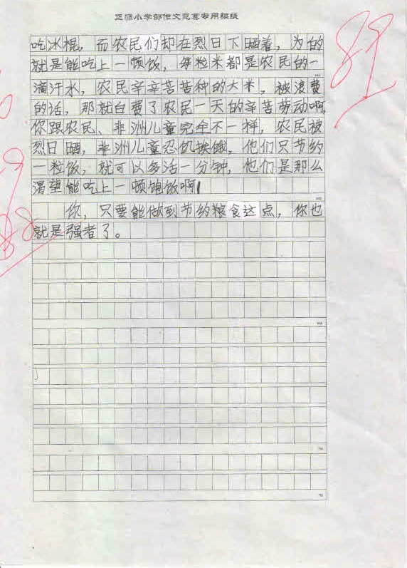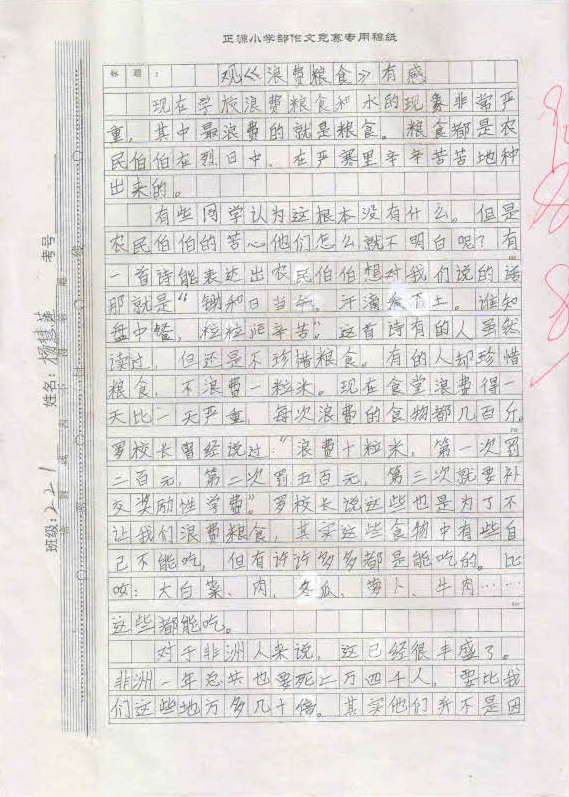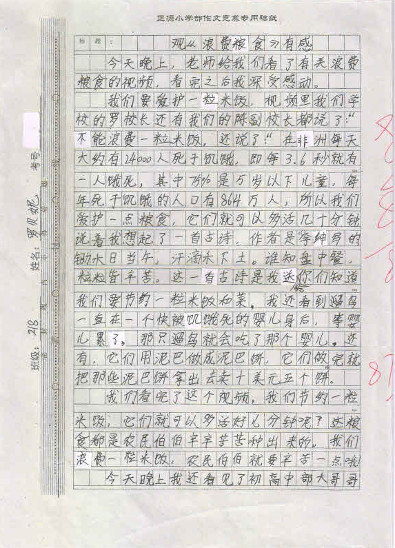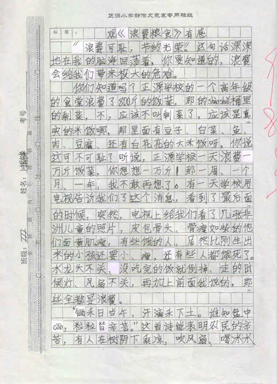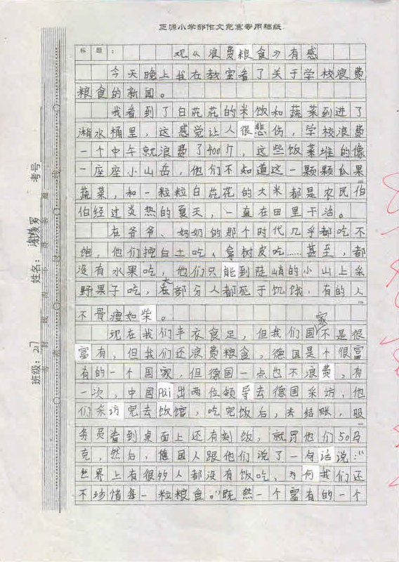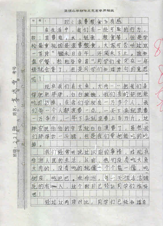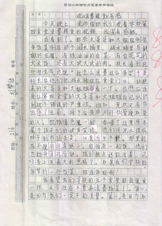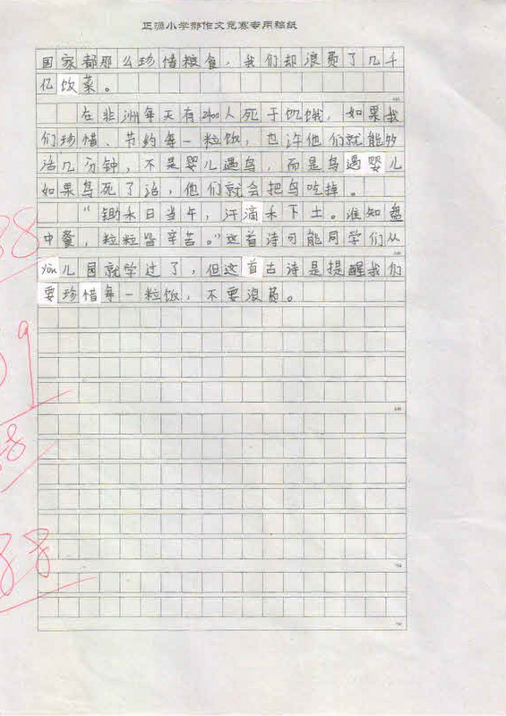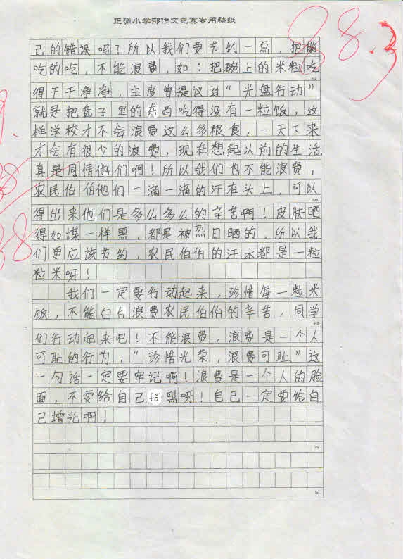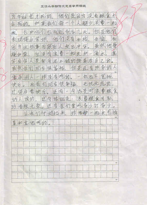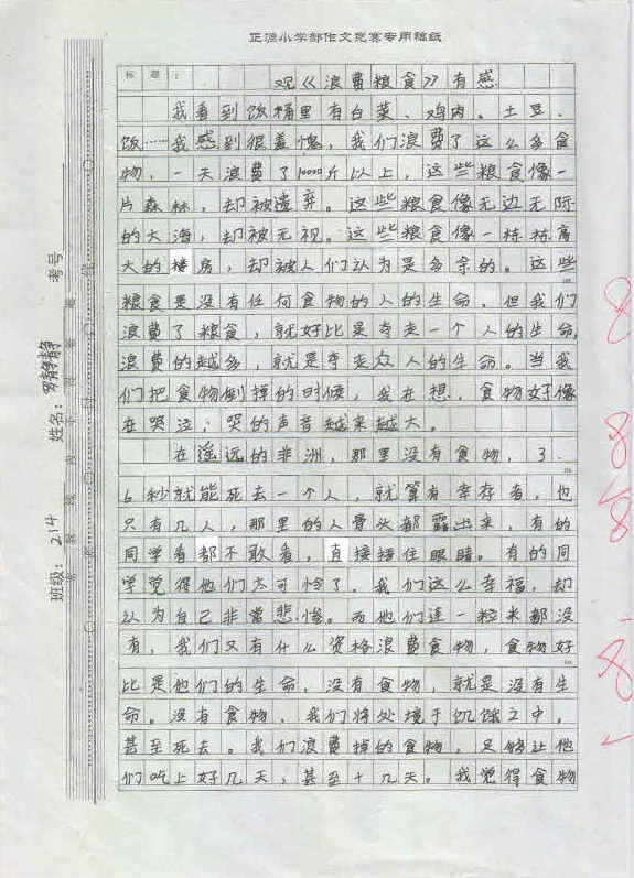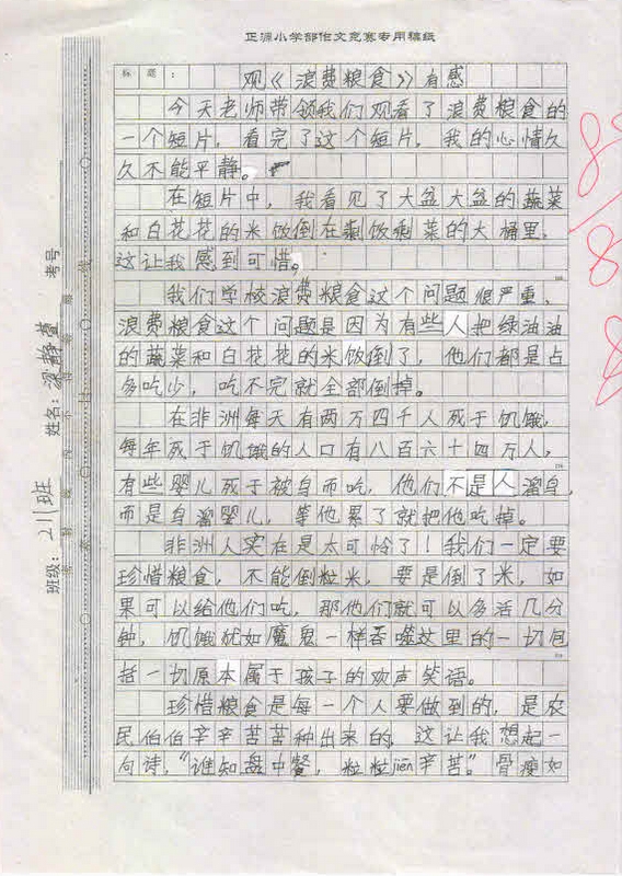 作品内容丰富,能围绕中心写出小作者的真情实感,表达出孩子们节约粮食,反对浪费的决心。这不仅仅是一次普通的作文竞赛,更是对孩子们一次深刻的思想教育,将在孩子们的成长过程中起到深远的作用。
