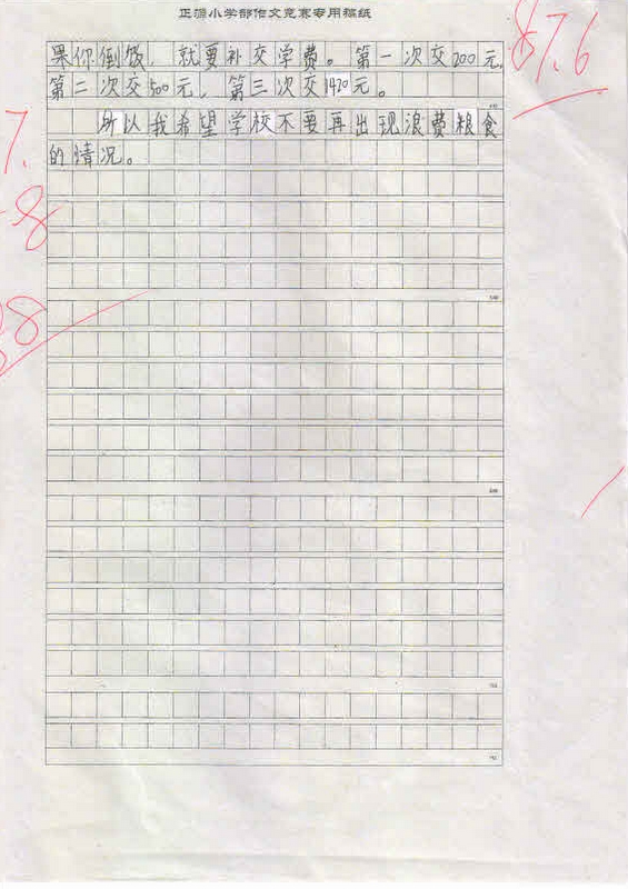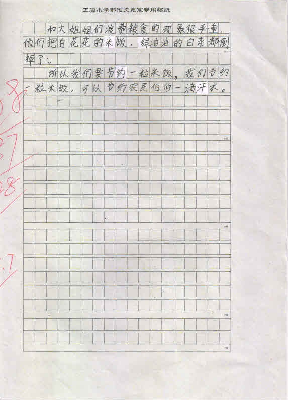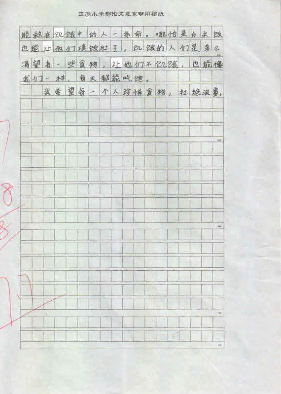 为了激发学生养成珍惜粮食、勤俭节约的好习惯,进一步培养和提高学生的写作兴趣,根据罗校长和小学部语文教研组的统一安排,5月14日晚自习期间,小学部三年级举行了以“节约粮食”为主题的作文竞赛。