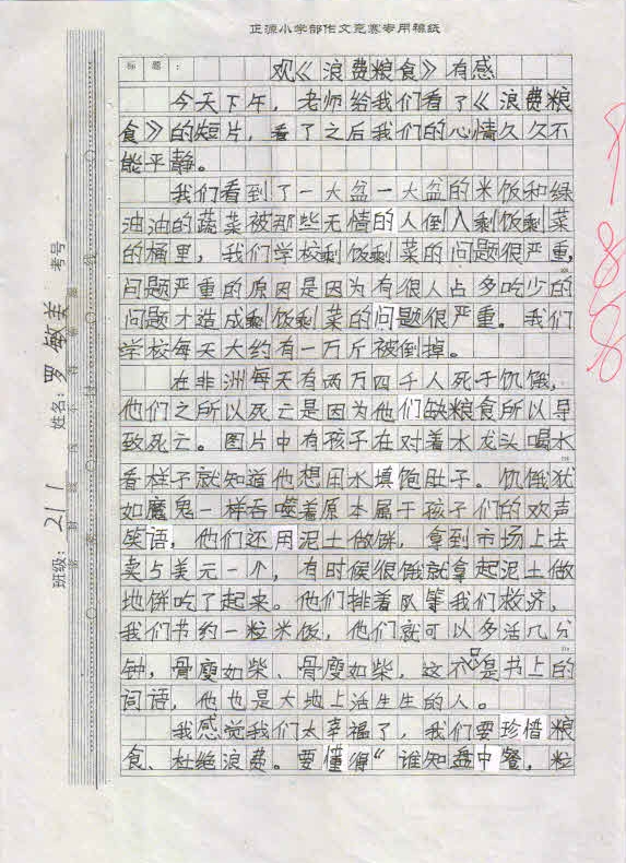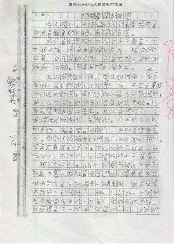 小学部三年级举行“珍惜粮食”视频观后感作文竞赛
