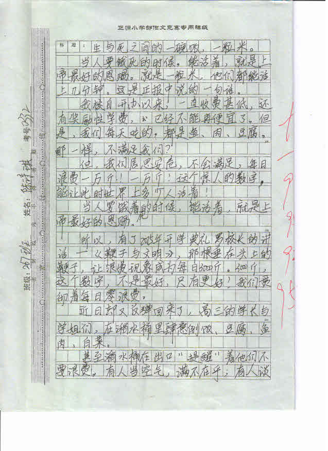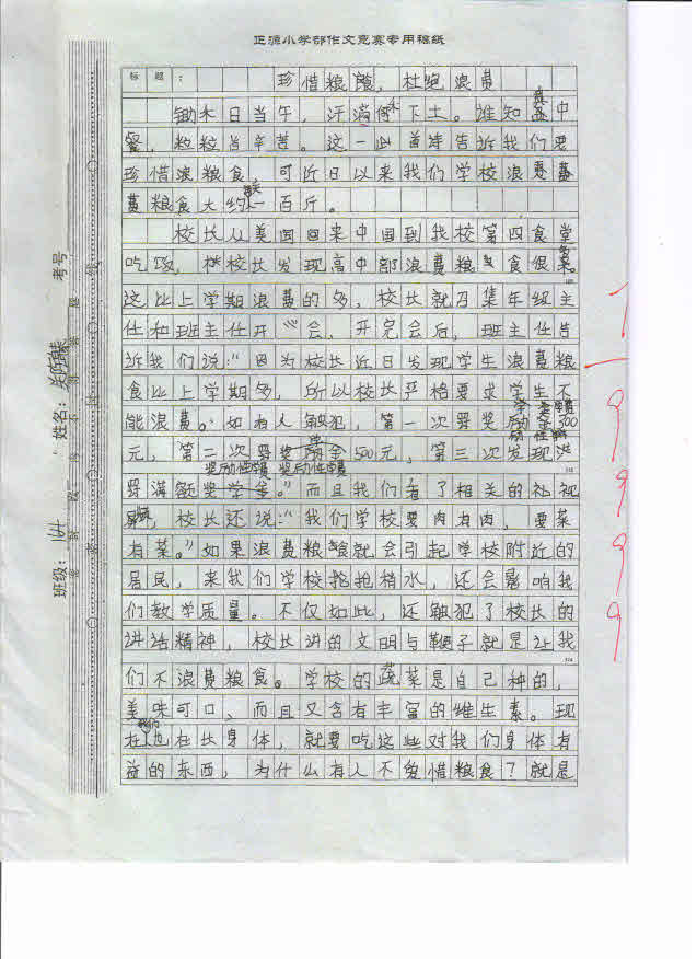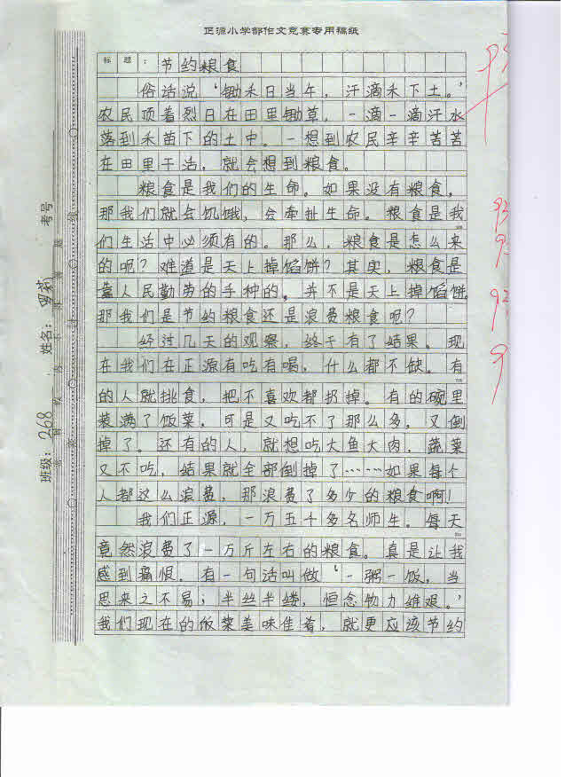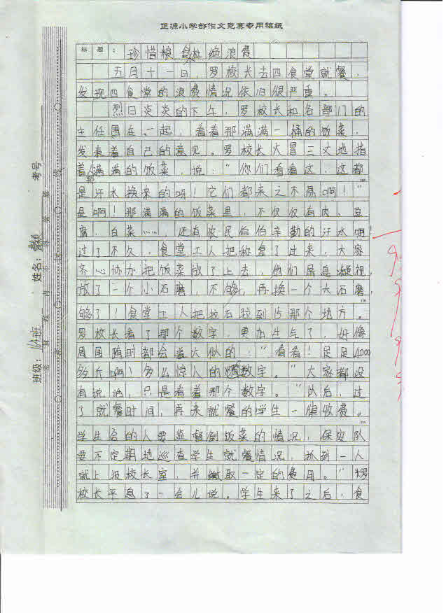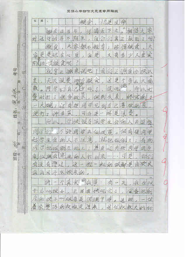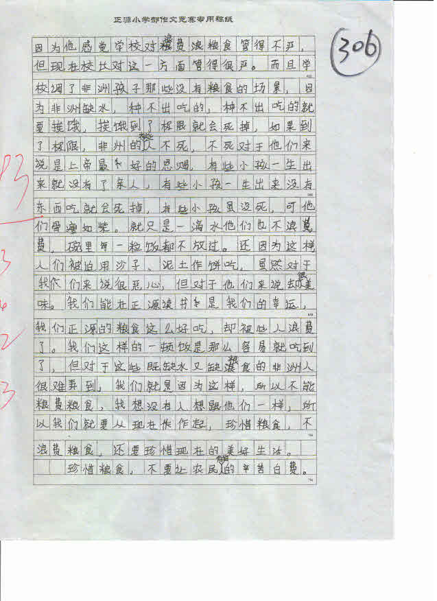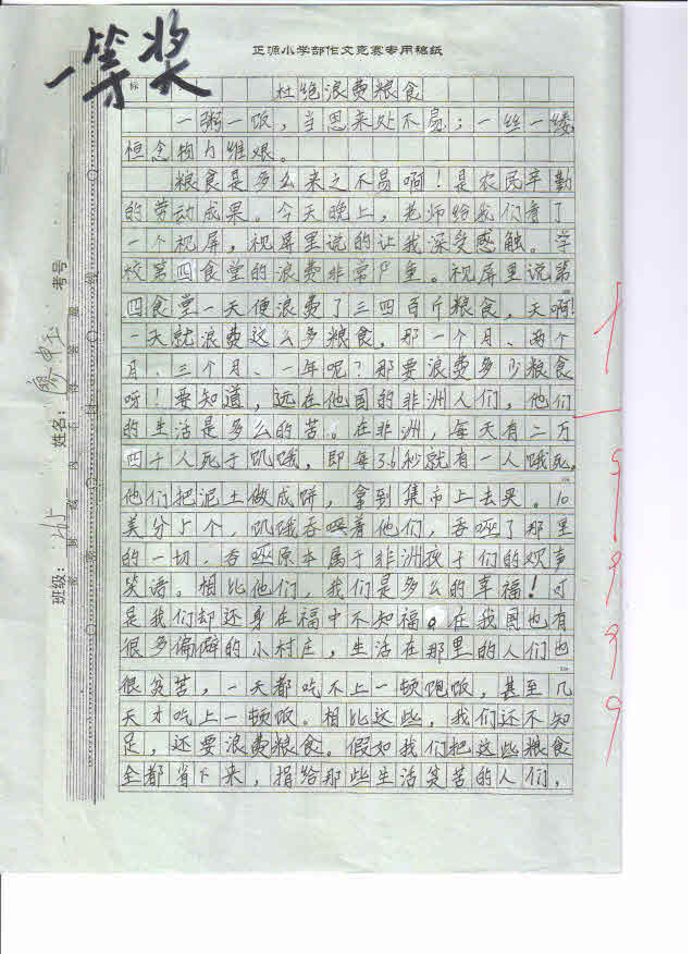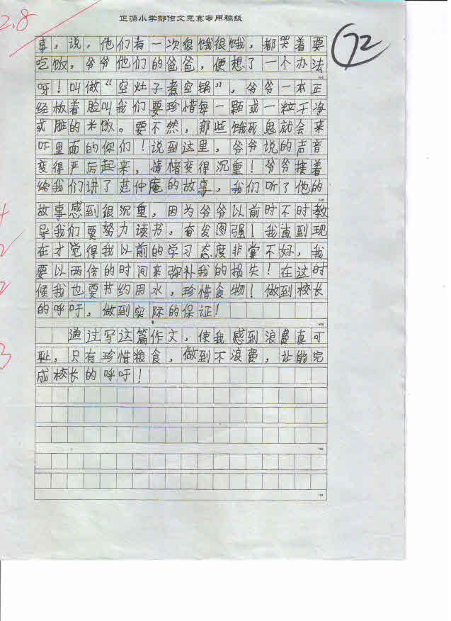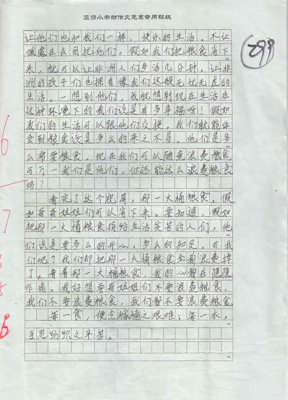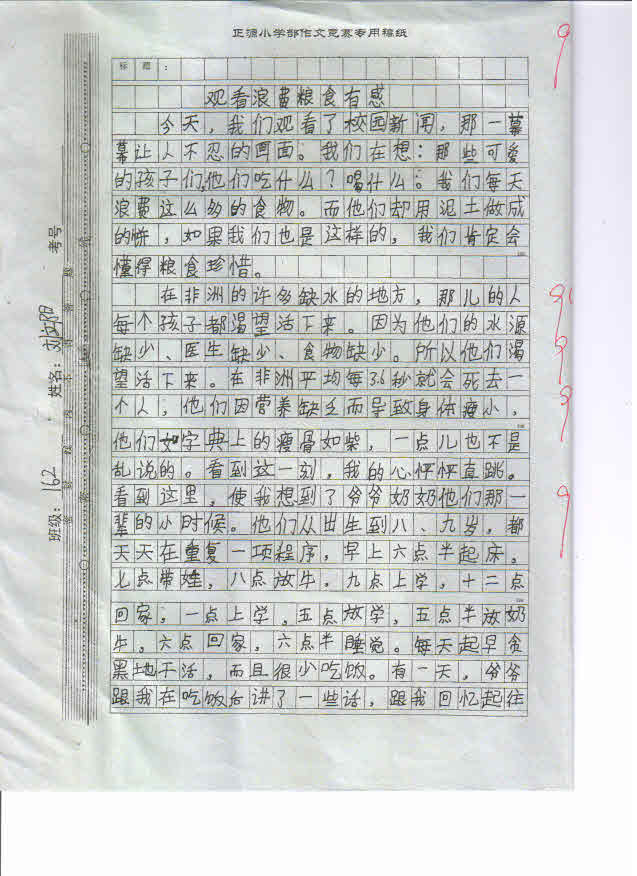 本次以观看“珍惜粮食”这一视频为前提进行的作文竞赛,从学生切身实际出发,立足于学生日常饮食,影响力度不言而喻。本次作文竞赛也让学生明白节约粮食不是一句口头语而已,节约是美德,节约是品质,节约更是责任。我们都是正源这个大集体的一份子,生活在这个舒适的环境中,我们都要用心去爱护它、关心它。从日常小事做起,不仅仅是节约每一次饭菜,随手关灯,随手关水龙头,更要让“节约光荣,浪费可耻”的观念在校园里蔚然成风!