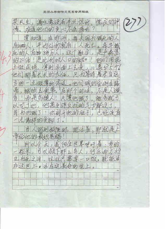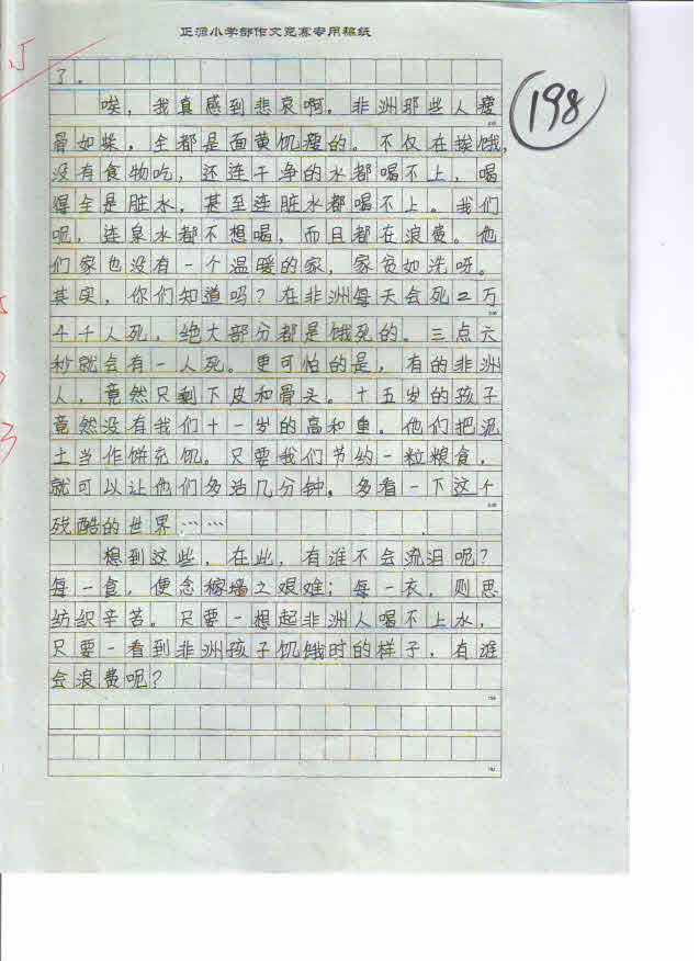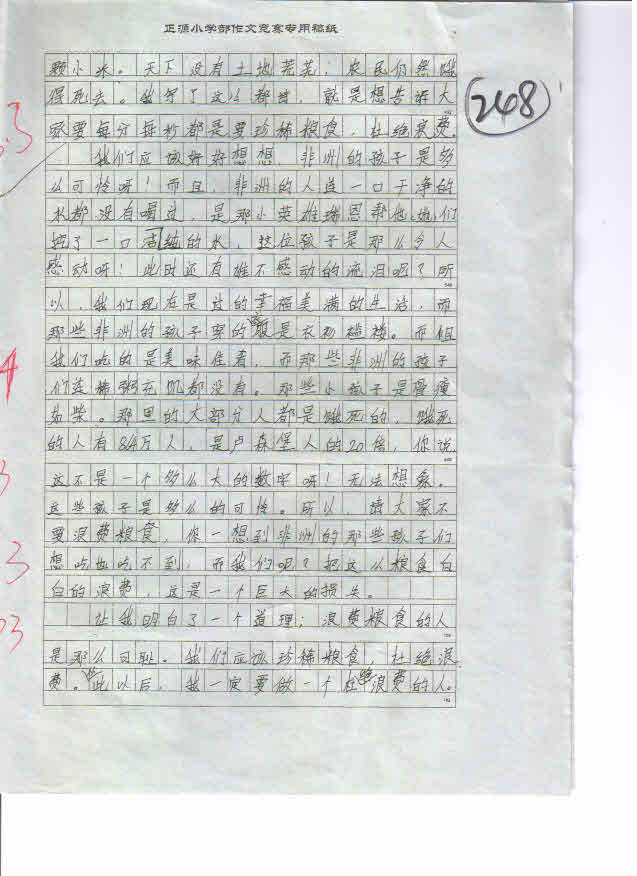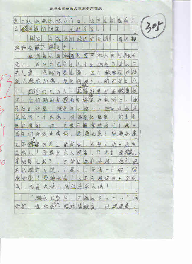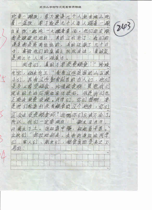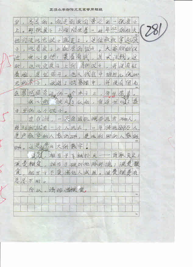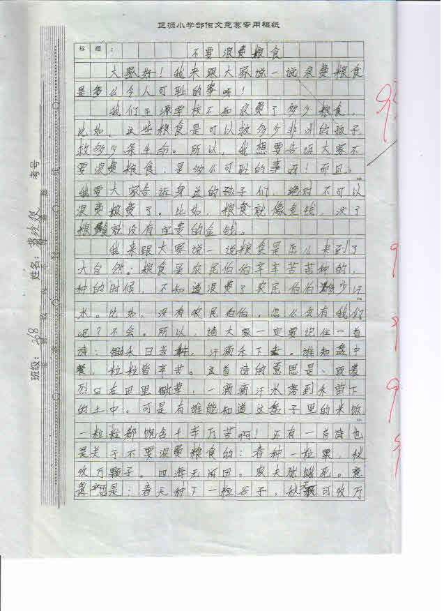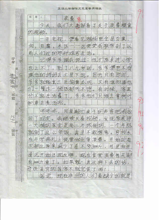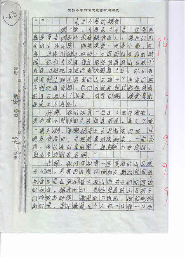 本次以观看“珍惜粮食”这一视频为前提进行的作文竞赛,从学生切身实际出发,立足于学生日常饮食,影响力度不言而喻。本次作文竞赛也让学生明白节约粮食不是一句口头语而已,节约是美德,节约是品质,节约更是责任。我们都是正源这个大集体的一份子,生活在这个舒适的环境中,我们都要用心去爱护它、关心它。从日常小事做起,不仅仅是节约每一次饭菜,随手关灯,随手关水龙头,更要让“节约光荣,浪费可耻”的观念在校园里蔚然成风!