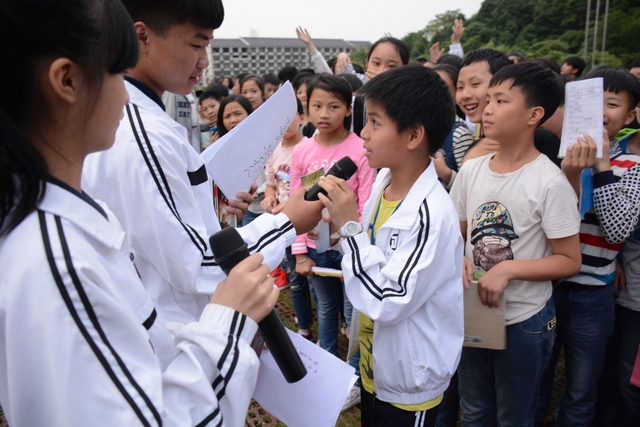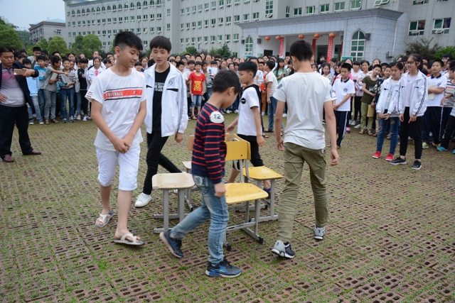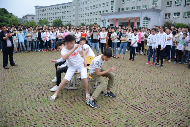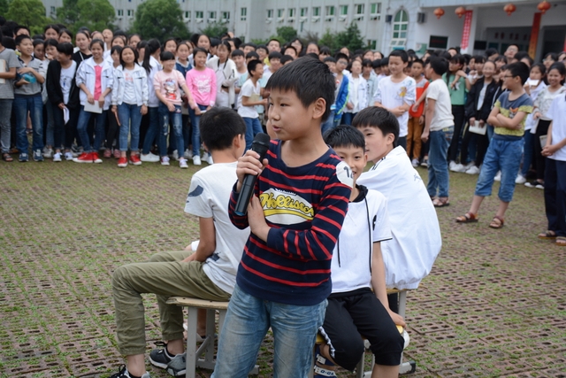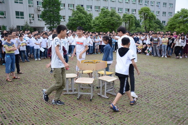 到了做游戏的环节,同学们就如同脱缰的野马,每个人都要高高地举起手臂,想要到舞台中心参加表演。最经典的游戏——“抢凳子”再次重出江湖。第一轮邀请6位来自不同班级的同学,4男2女参加游戏环节。音乐一响,同学们立马跟随音乐转起来,眼睛直勾勾地望着围着的凳子,生怕被抢走。音乐一停,6位立马以迅雷不及掩耳之势坐到自己面前的凳子上。可能是身体太过娇小的缘故,身形较小的一位女生,在音乐停止的时候,直接被身旁的两位男同学给“弹”了出去,遗憾地被淘汰了。淘汰后的女生用流利的英语,运用课堂上学过的句型和句式介绍了自己的姓名、班级、兴趣爱好等。随即,音乐再次响起,唯一的“女将”卯足了劲,使出全身力量,势必要在这一局胜出,为同胞“一雪前耻”。可惜的是,这位女同学身高虽然占了优势,但是力量不够,依然被四位“猛虎”直接给“弹飞”了,惹得在场的同学哄笑一堂。紧接着,四位“猛虎”火力全开,进行比拼,你不让我,我不让你,最终,一位来自C294班的男生获得“抢凳子”游戏的胜利。他不仅用英语介绍了自己的基本信息,还和同学们分享了玩游戏的感受。这真正达到了激发学生学习英语的积极性,提高学生英语口语的表达能力的目标。