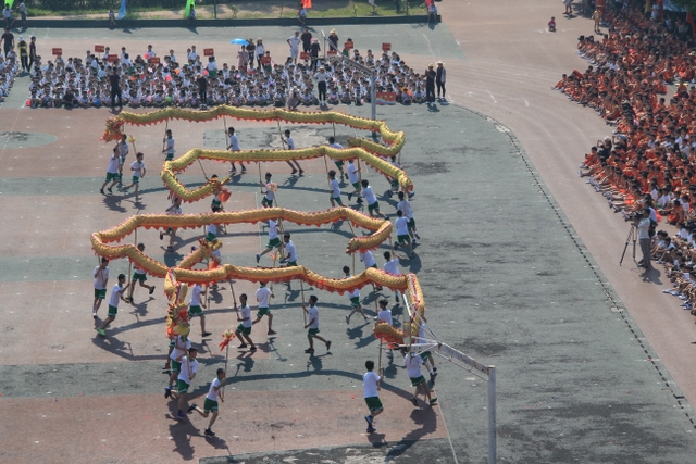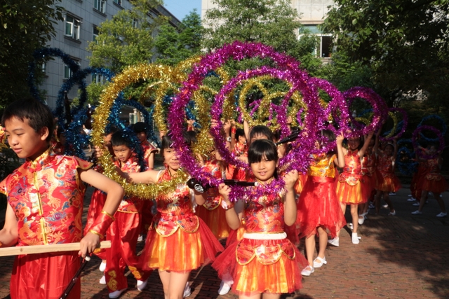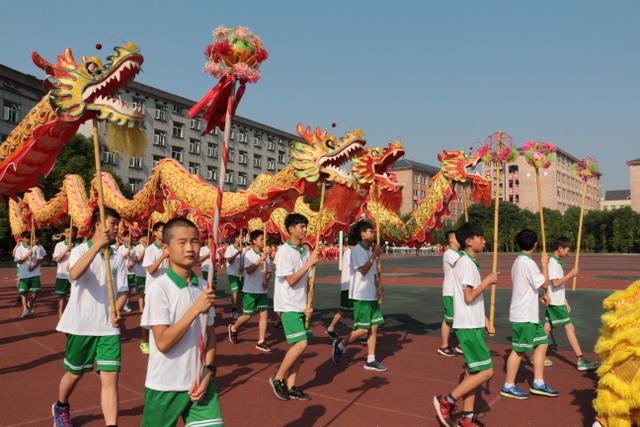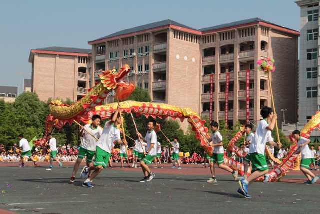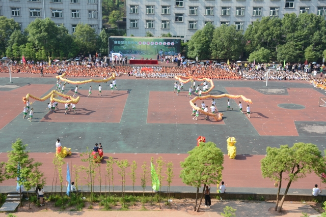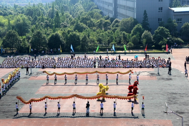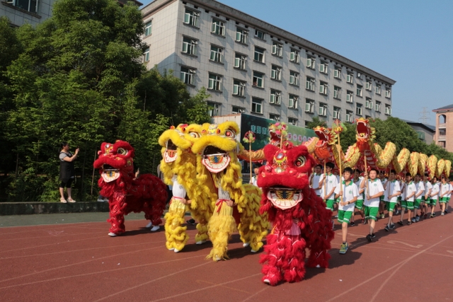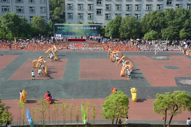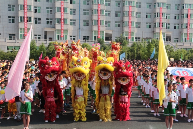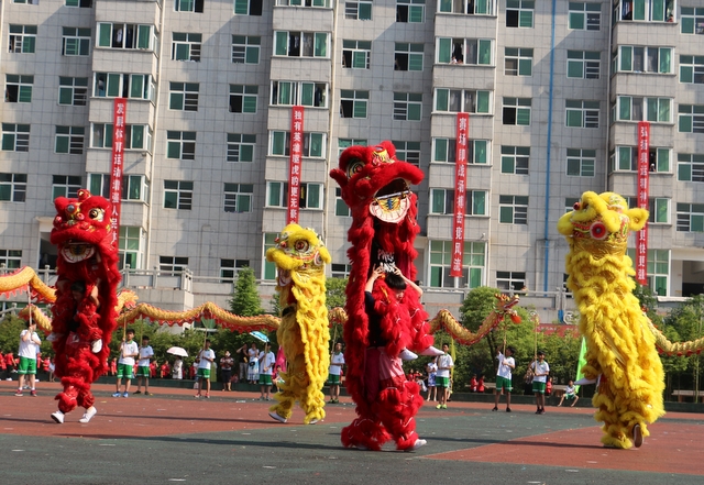 开幕式节目表演开始了。六年级48人组成的龙狮队率先亮相。四条巨龙金光闪闪,张牙舞爪,腾云驾雾,横空而来。时而如卷巨浪,翻江倒海;时而欲上九天,翘首揽月。两只黄狮、两只红狮在巨龙间穿梭,时而站在膝上摇头晃脑,时而抱着腰间半空旋转,时而亲昵戏谑,时而顶马爬臀,春风得意之时口吐莲花:祝正源校运昌隆……全场掌声雷动,经久不息。