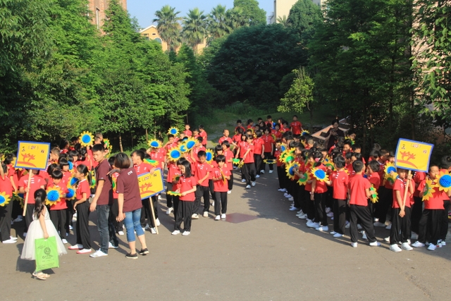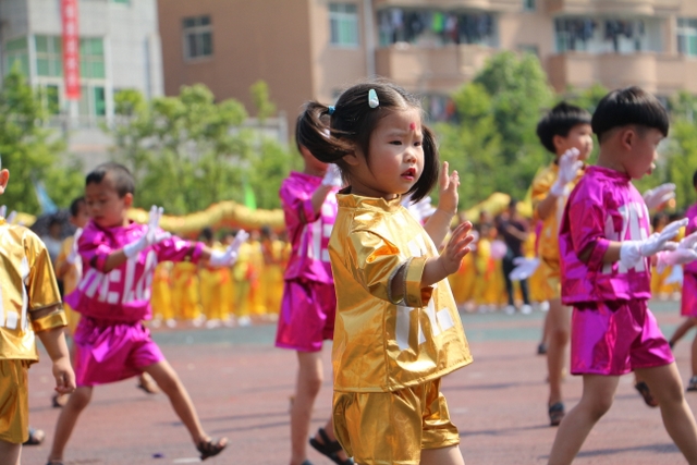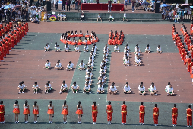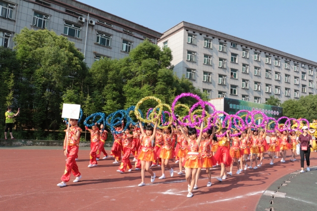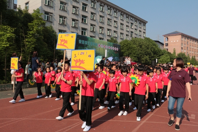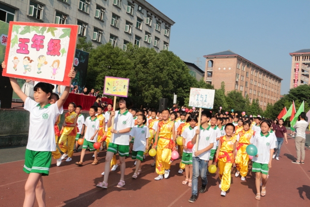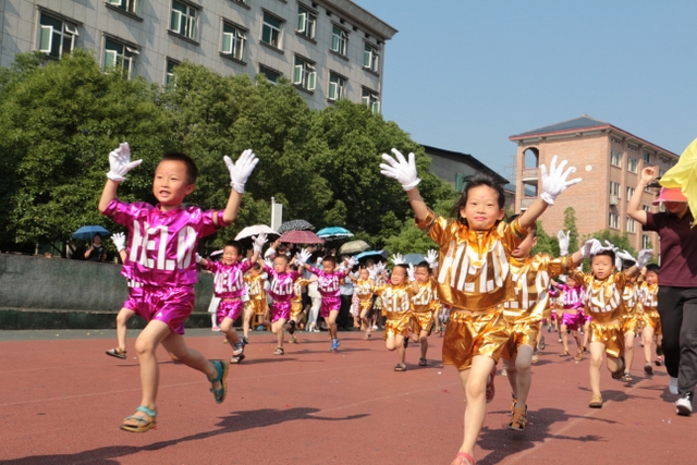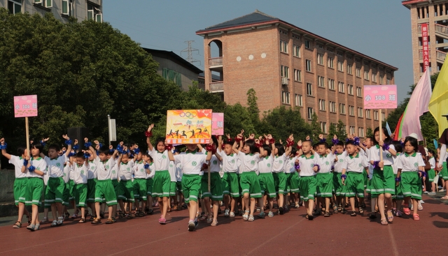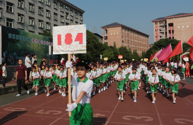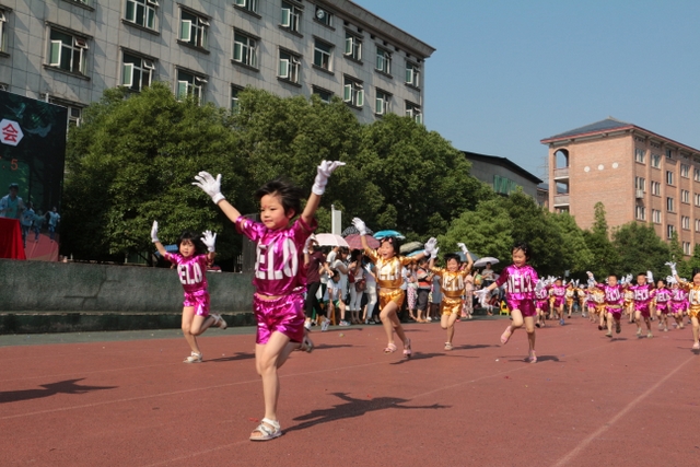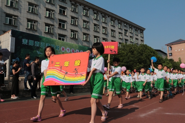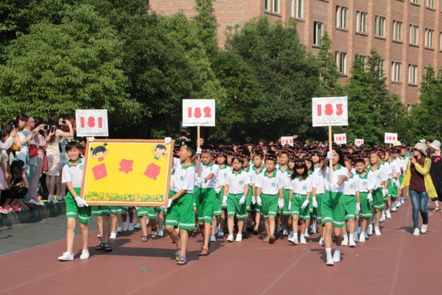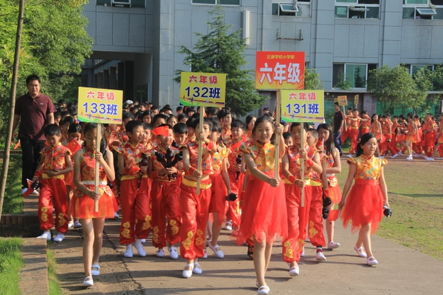 接下来是各年级方阵入场。各年级服饰、道具匠心独运,别具一格,争奇斗艳,引人入胜。他们高喊着不同的口号,昂首阔步,从主席台前走过。六年级的同学身着彩色服装,手拿葫芦丝;五年级同学身着武术服装和校服,手执气球;四年级同学头顶五颜六色的花环,手戴雪白手套;三年级同学着装上红下黑,手执向日葵;二年级同学挥舞气球;一年级和幼儿班的同学们手腕上套着彩色花球,琳琅满目,美不胜收。