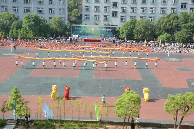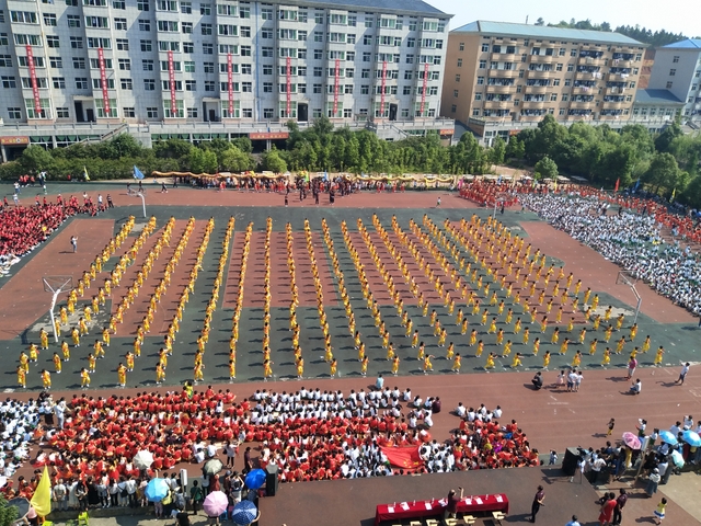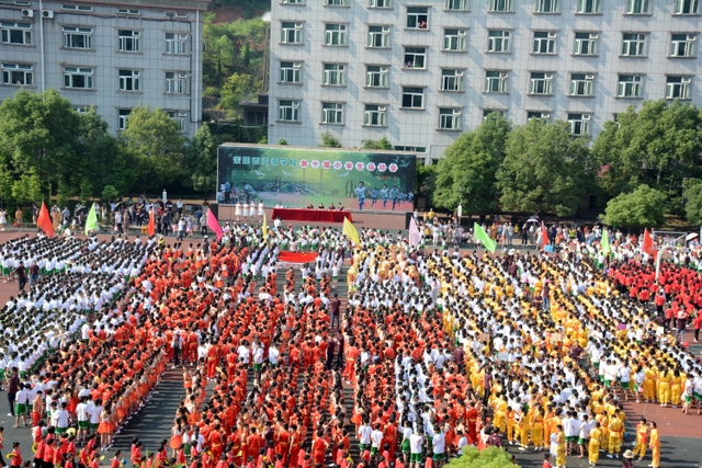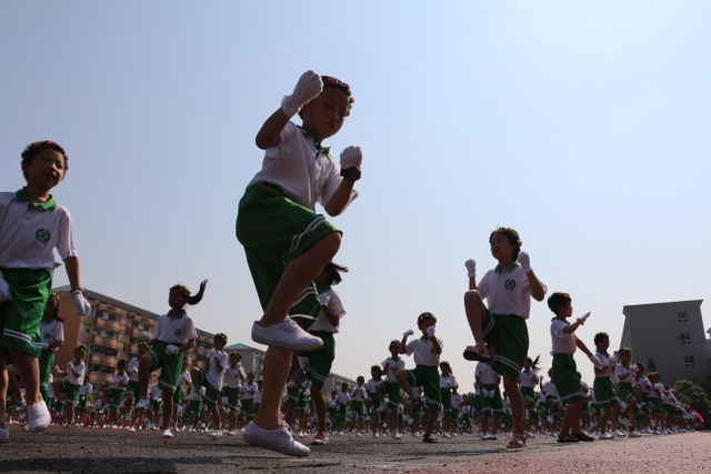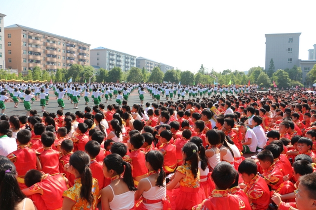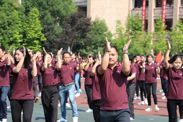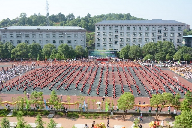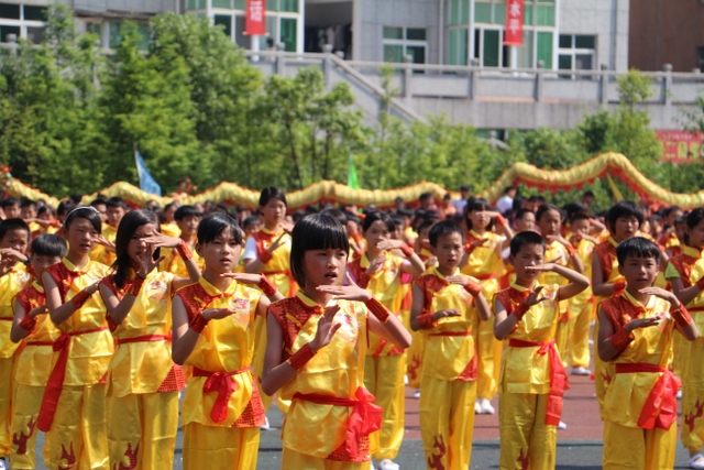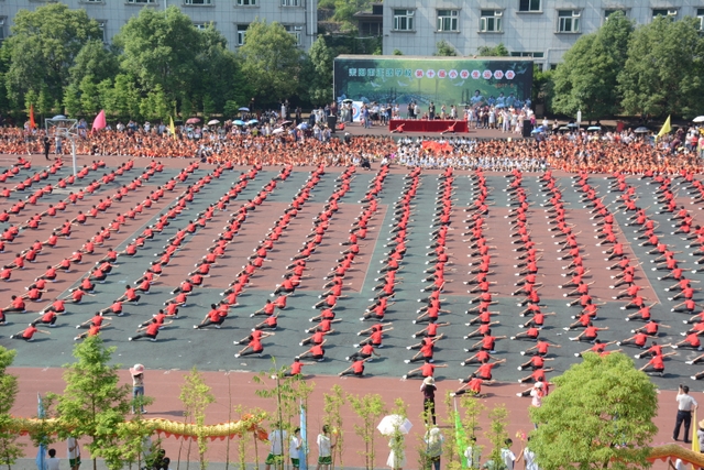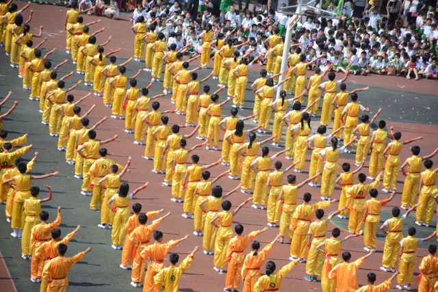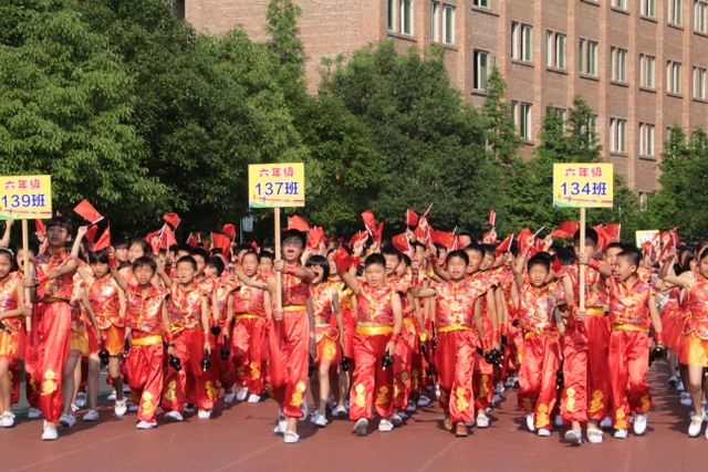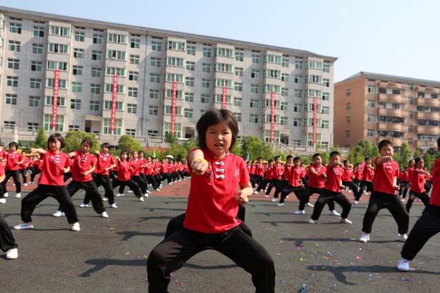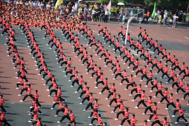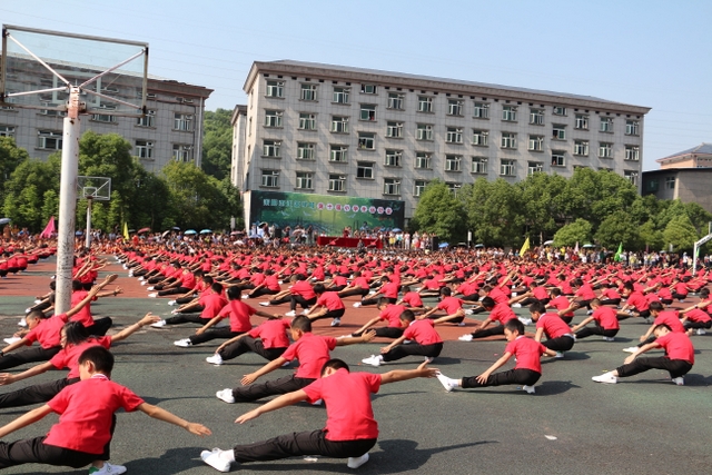 三年级全体学生628人表演五步拳。鲜红的上装,漆黑的运动裤,雪白的运动鞋,色彩鲜明。在台上指导老师的指令下,台下学生敬礼,礼毕,左弓步出拳,右弓步出拳……口令刚劲有力,动作虎虎生风,一曲《中国功夫》的伴唱更是把氛围推向极点。